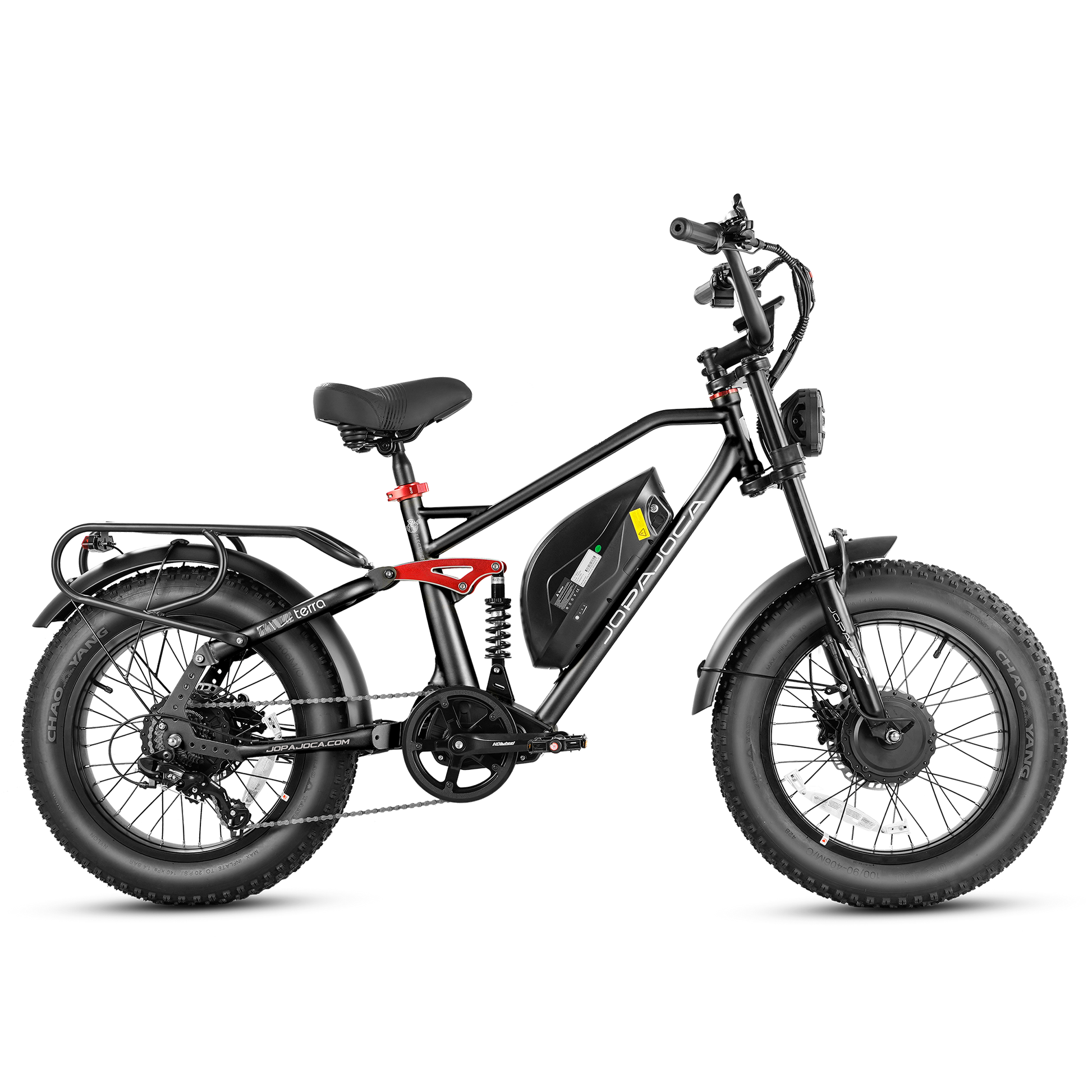 A: The Terra II features dual 1500W brushless motors, providing a combined 3000W power output with 85-95 N·m torque, enabling speeds up to 33 mph and the ability to tackle 30-40 degree slopes. It comes equipped with a 48V 20Ah removable battery, offering a range of approximately 50-60 miles per charge, depending on usage conditions. The bike is built with a full suspension system and dual 180mm hydraulic disc brakes for enhanced comfort and safety. Its 20" x 4.0" puncture-proof fat tires ensure stability and grip across various terrains.