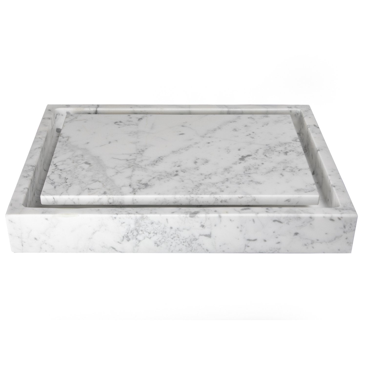 Inspired by the infinity pools found at so many high end hotels and contemporary residences the Eden Bath line of Infinity Pool Stone Sinks is a wonderful interpretation of a modern design trend. The beauty of the infinity pool stone sink is that it is made of two unique pieces the sink base (which can be used by itself as a regular rectangular stone sink) as well as the infinity insert which is a raised slab that sits inside of the sink base. With the drain hidden the sink demands attention from anyone who lays eyes on it its unique design will be a centerpiece of your modern bathroom. This particular model is made of polished white carrara marble which provides a pure white base with dark gray veins.