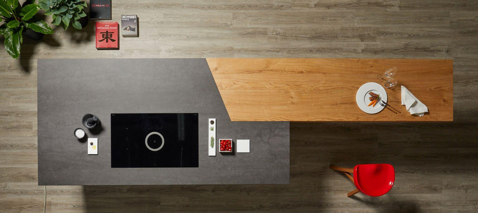 Combines four induction cooking zones with a built-in downdraft extractor, creating a seamless installation without overhead hoods.