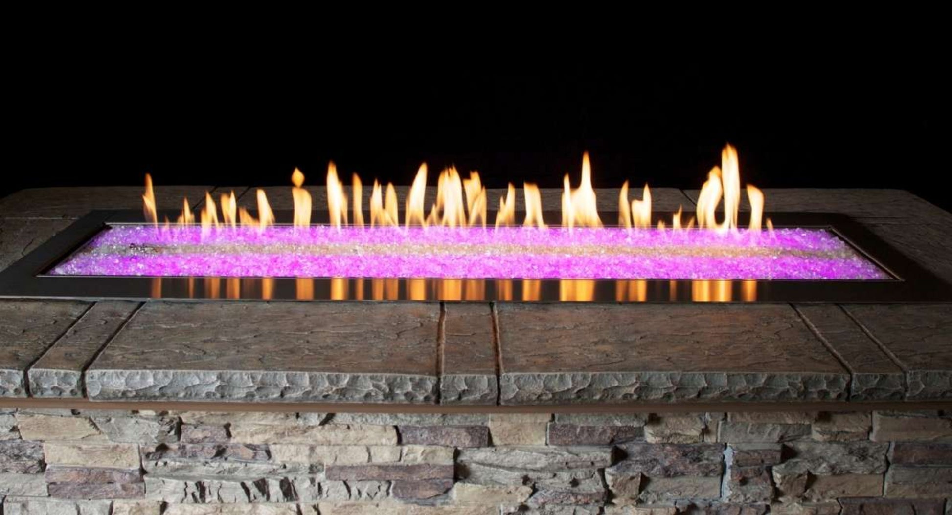These single-sided models conceal a gas burner beneath a large bed of clear-frost crushed glass. While the flames dance atop the bed of glass, the lighting system illuminates the glass from beneath. A glass deflector shield helps protect the flame from wind. (Optional taller deflectors are available for fireplaces installed in windier locations.)