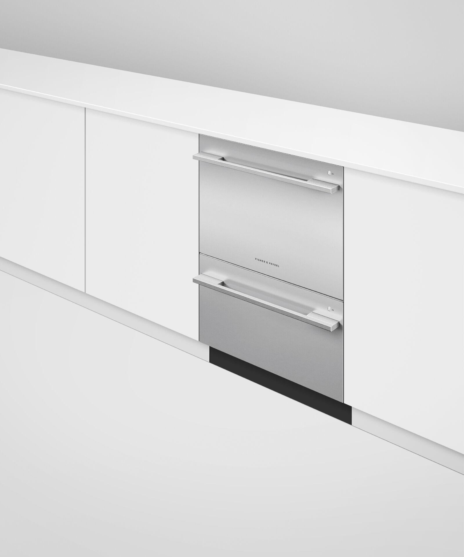 Double‑drawer format holds slightly fewer items than full-width dishwashers—best for households that run frequent smaller loads.