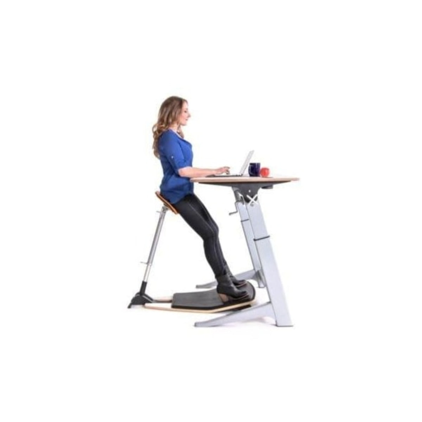 A: The chair promotes an open hip angle and encourages a neutral spine position, reducing pressure on the lower back. The ability to alternate between standing and sitting helps maintain an active, upright posture throughout the day.