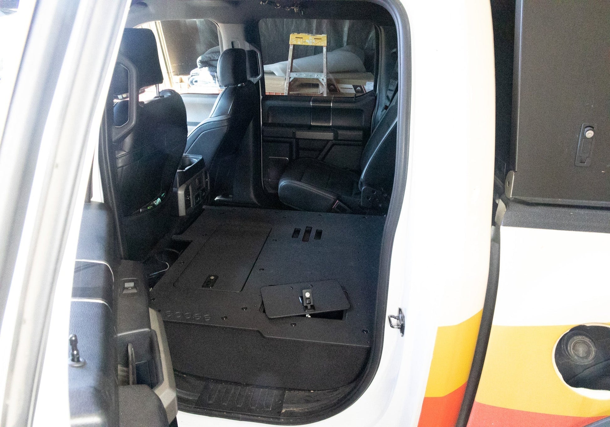 Second Row Seat Delete Plate System creates a flat, secure platform for gear storage.