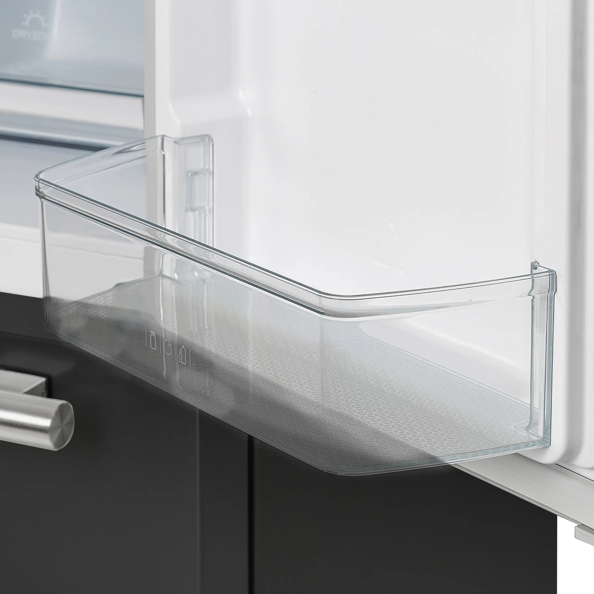 - Equipped with see-through drawers and door bins for effortless organization and instant visibility.