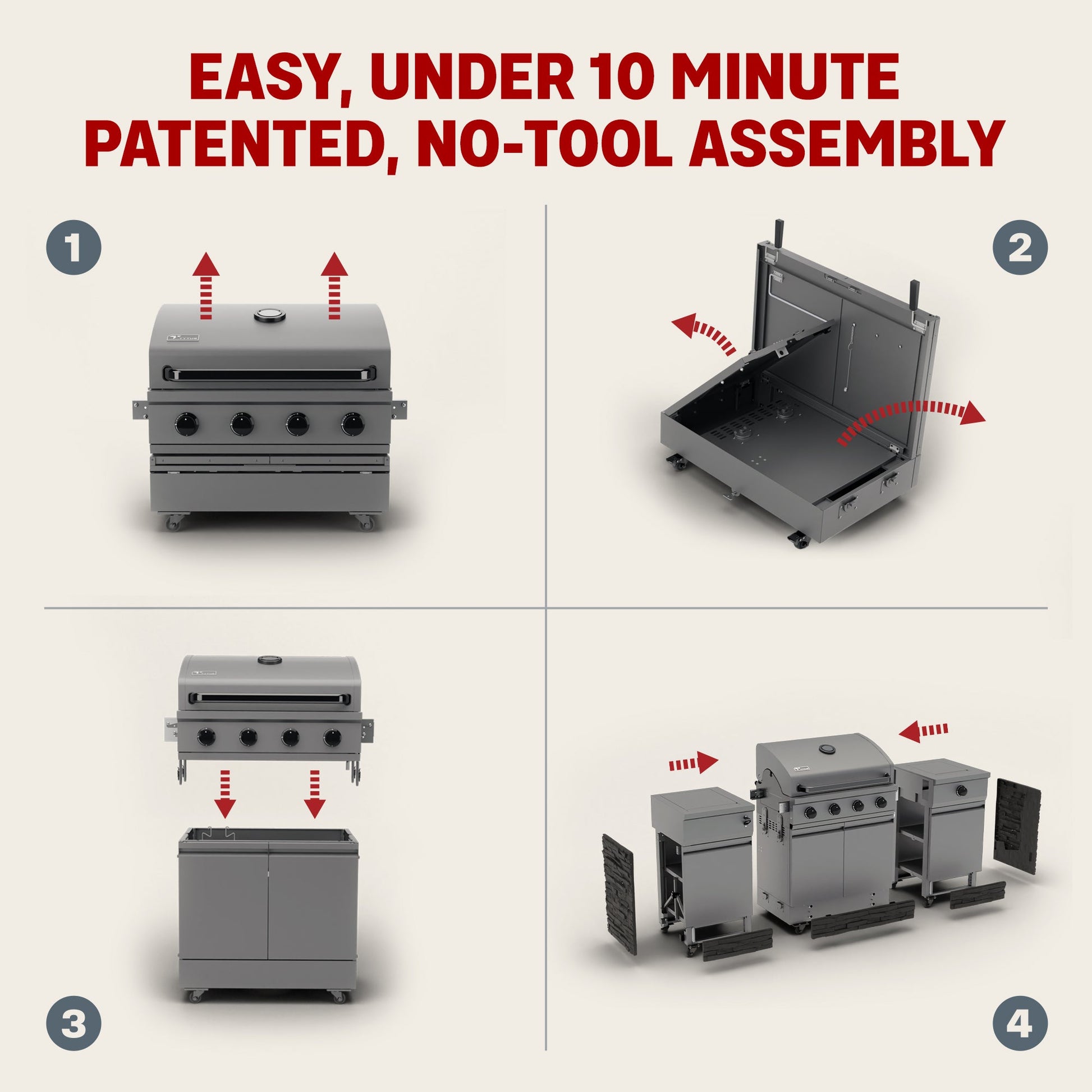 A: Includes built-in tool hooks, bottle opener, side table, enclosed storage cabinet, and a patented no-tool assembly system for fast setup.