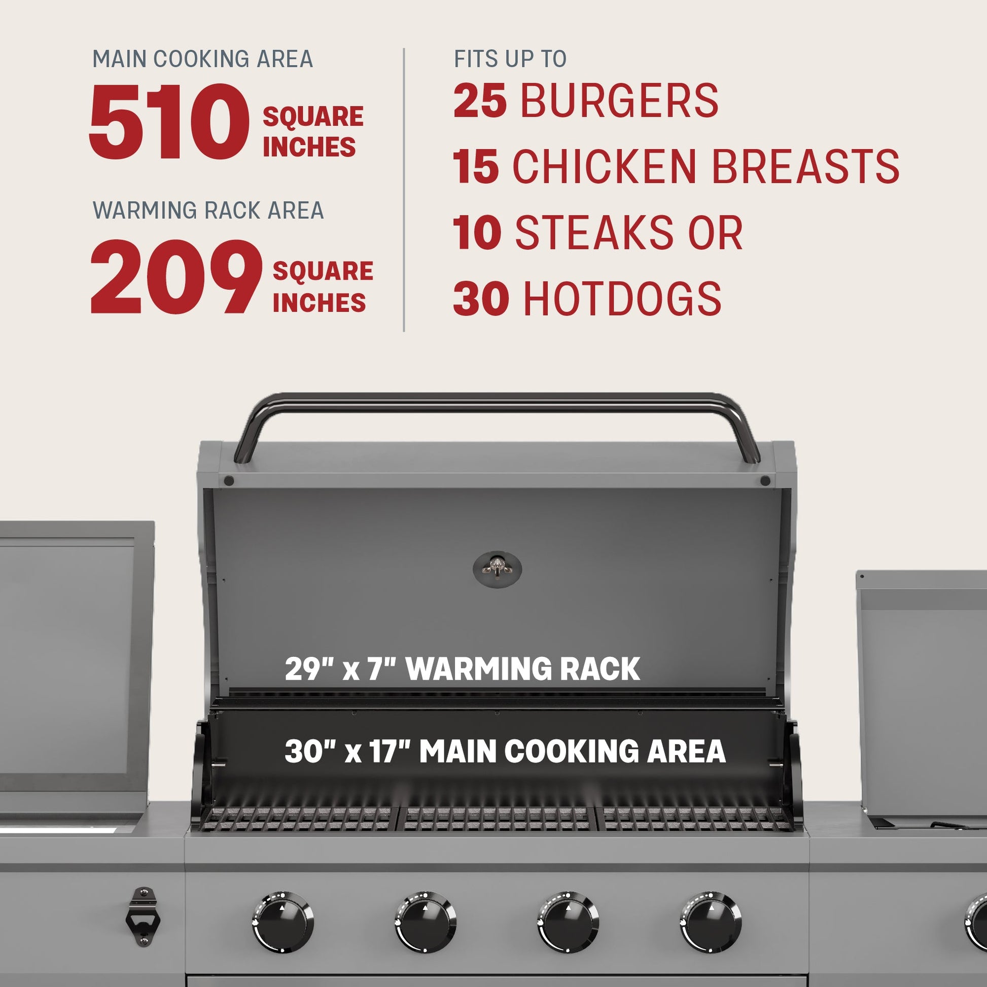 A: Offers approximately 719 sq in of total cooking space, providing plenty of room for grilling steaks, burgers, vegetables, and more at the same time.
