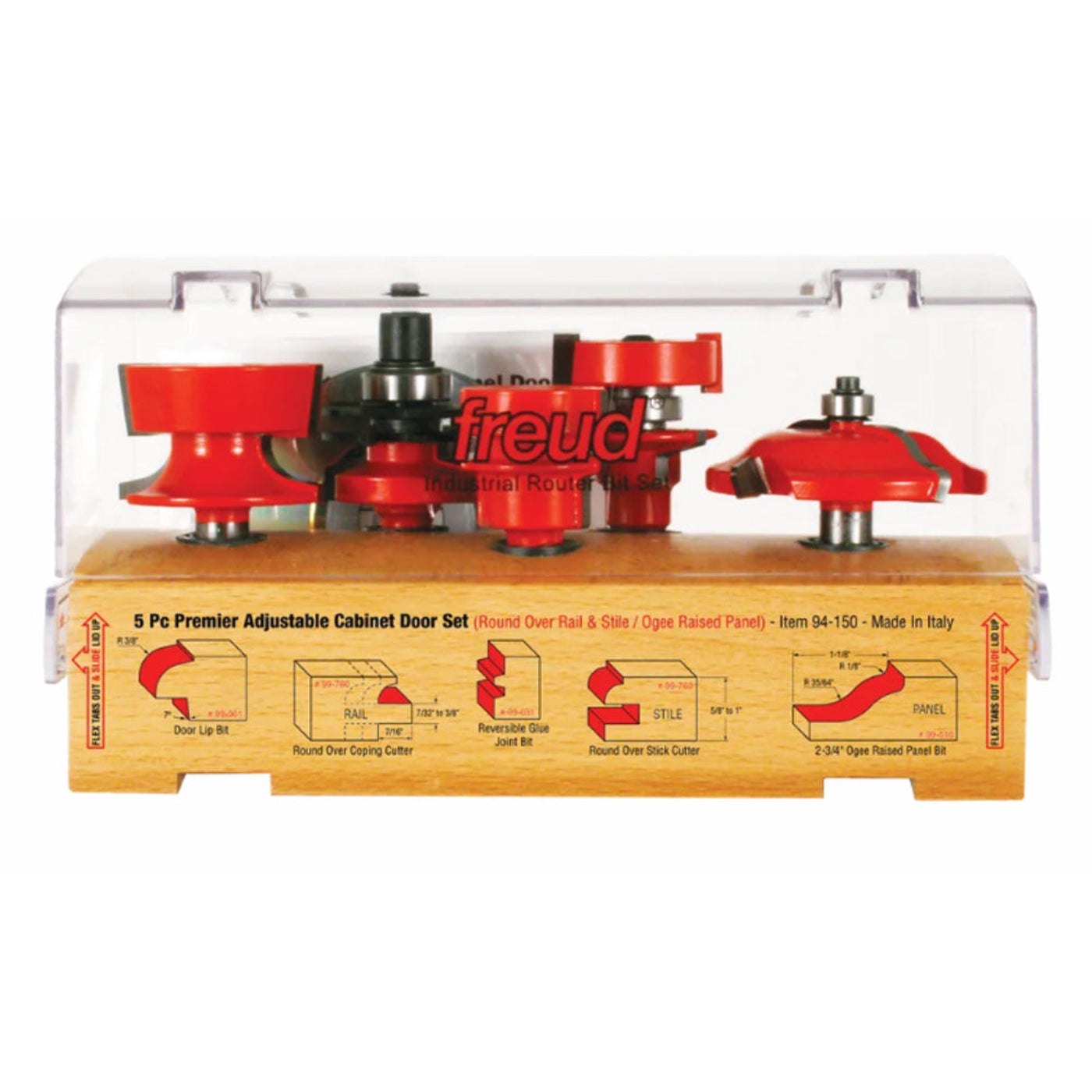 Freud's Premier Adjustable Cabinet Bit Set includes the tools to produce several popular door styles. Use the unique to make raised panel or flat panel doors from 5/8" to 1-1/4" thick. If you're making a raised panel door, use the Raised Panel bit (#99-510) with Quadra-Cut technology to mill beautiful ogee-style raised panels. Or use the Door Lip Bit (#99-001) to make traditional 3/8" overlay doors, routing the rabbet and finished profile in a single pass. And to glue up stock for wide panels, use the for strong, accurate joints. All bits have 1/2" shanks and should be used on table-mounted routers.