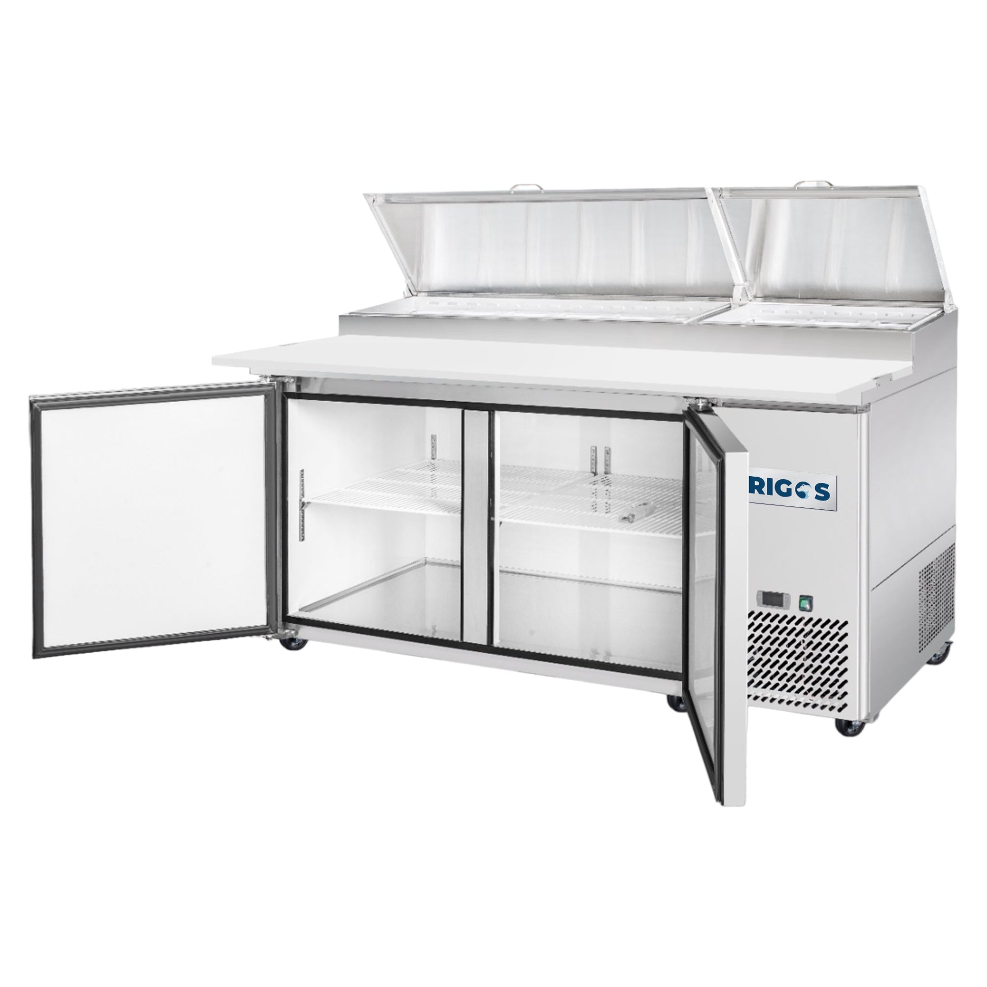 High-capacity prep: 67" width with two solid doors provides ample refrigerated storage and workspace for pizza preparation.
