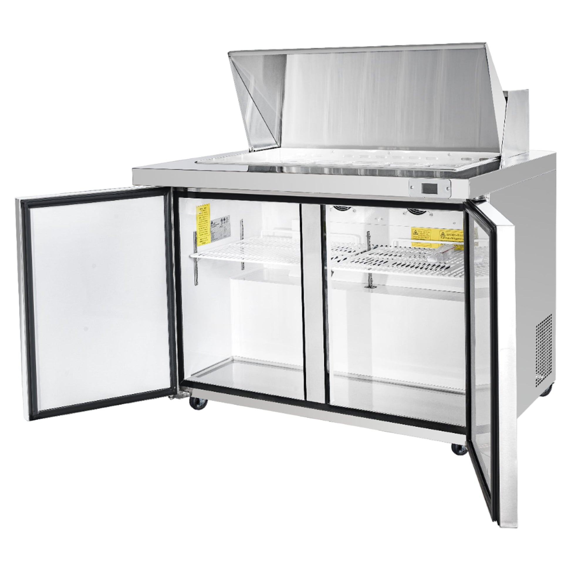 High-capacity mega top: 48" width with two doors offers ample refrigerated storage and elevated prep surface.