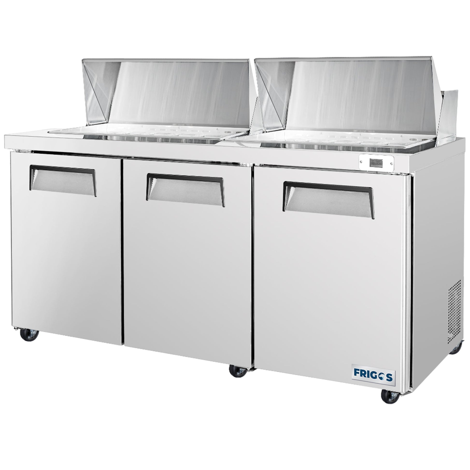 Introducing our flagship 72" salad sandwich prep refrigerator, the Frigos FG-SWPT-72, meticulously engineered to meet the rigorous demands of your commercial kitchen. With precise dimensions of 72 inches in width, 30 3/8 inches in depth, and 45 3/8 inches in height, this unit offers an expansive workspace for all your food preparation needs.