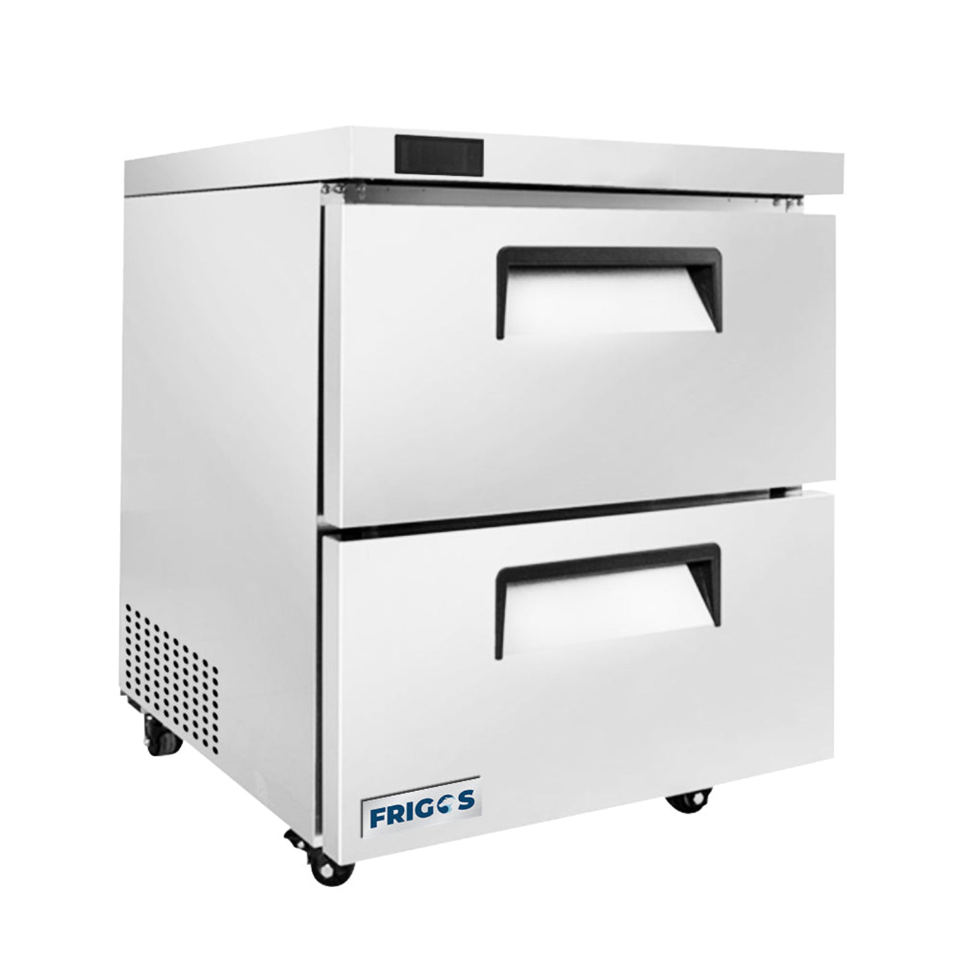 The Frigos FGA-UCR-2DR-28 27" Two Drawer Undercounter Refrigerator offers durability with its stainless steel exterior and interior, reinforced with a sturdy top. Designed with R290 refrigerant, it maintains precise temperatures between 35°F and 38°F, ensuring optimal food storage.