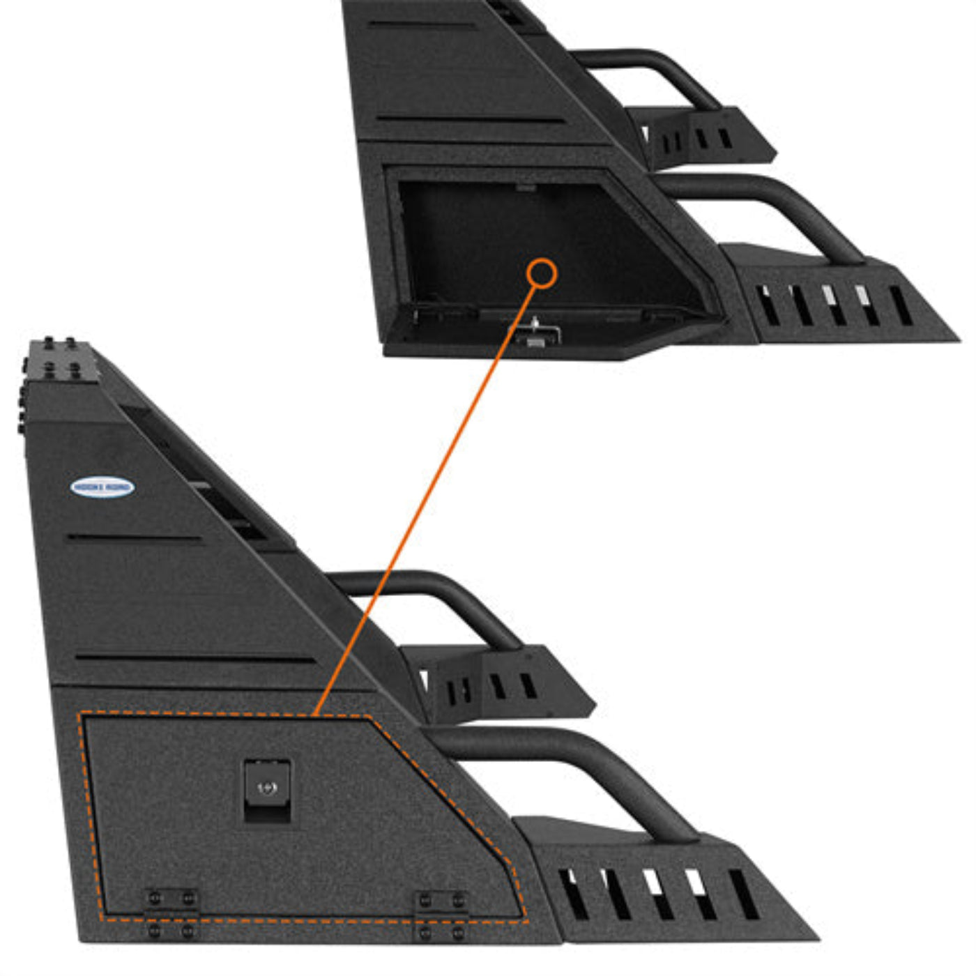 Rugged and Functional Roll Bar. The Hooke Road Roll Bar is a multifunctional addition to your truck. Beyond its impressive stature, it serves both utilitarian and safety purposes by providing roll-over protection. Beyond functionality, this roll bar significantly enhances the overall style of your vehicle, introducing a sporty appearance to your truck. The inclusion of two powerful 25W LED spotlights not only contributes to a rugged aesthetic but also ensures enhanced visibility during night driving. Additionally, the roll bar features side storage lockable boxes, a thoughtful design for convenient storage of outdoor gear, secured by high-tech, pick-resistant locks. The adjustable design offers versatility, allowing extension options to accommodate different sizes of trucks.