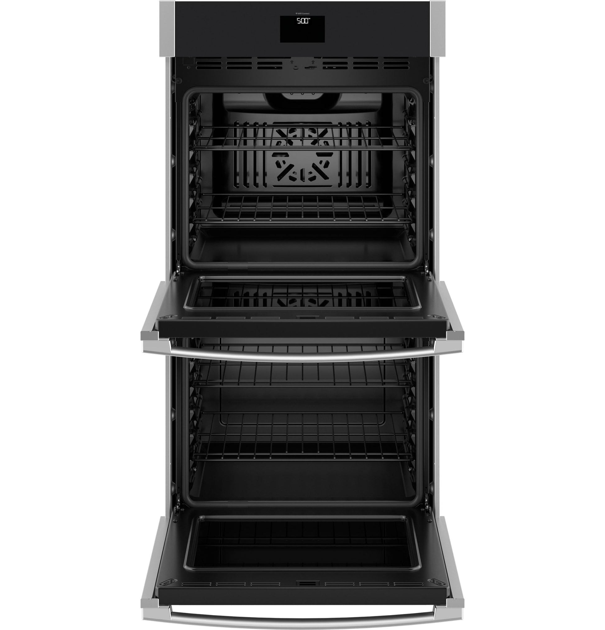 The brand GE JKD5000SVSS is a high-performance 27-inch built-in double wall oven designed to deliver professional-quality cooking results and exceptional convenience. With True European Convection in the upper oven, it uses a third heating element and fan to circulate hot air for even baking and roasting. The self-clean system includes a steam clean option for faster, odor-free maintenance. Touch glass controls offer intuitive operation with a sleek, modern look, while large oven windows and interior lighting allow easy monitoring of dishes. Both ovens offer a 5.0 cu. ft. capacity, giving you a total of 10.0 cu. ft. for cooking multiple dishes at once—ideal for holidays, large families, and entertainers. Finished in fingerprint-resistant stainless steel, the JKD5000SVSS blends seamlessly with contemporary kitchens, combining style, space, and performance