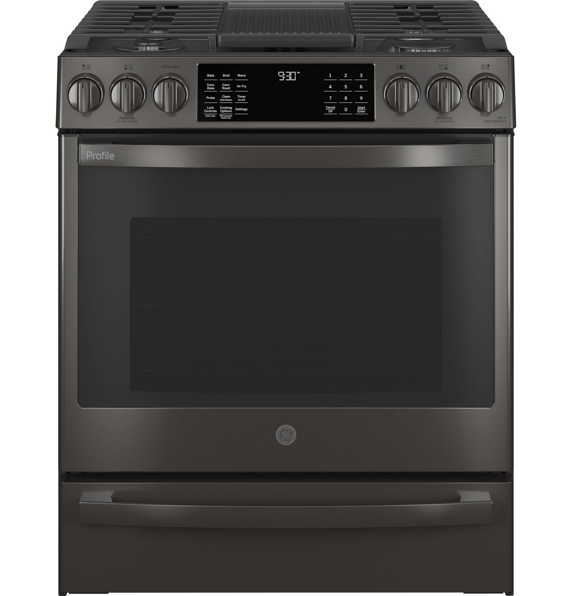 The brand GE PGS930BPTS is a 30" smart slide-in front-control gas range designed to deliver powerful performance and advanced cooking features in a sleek, modern package. This model includes No Preheat Air Fry for healthier, crispy results without waiting, and a convection oven that promotes even baking and roasting. Its Edge-to-Edge cooktop provides a seamless cooking surface with five versatile burners, including a 21,000 BTU tri-ring burner for rapid boiling and precise simmering. With WiFi connectivity, you can control oven functions remotely using the SmartHQ™ app, and integrated voice control compatibility adds convenience. The Fingerprint Resistant Black Stainless Steel finish resists smudges while delivering a sophisticated look that complements modern kitchens.