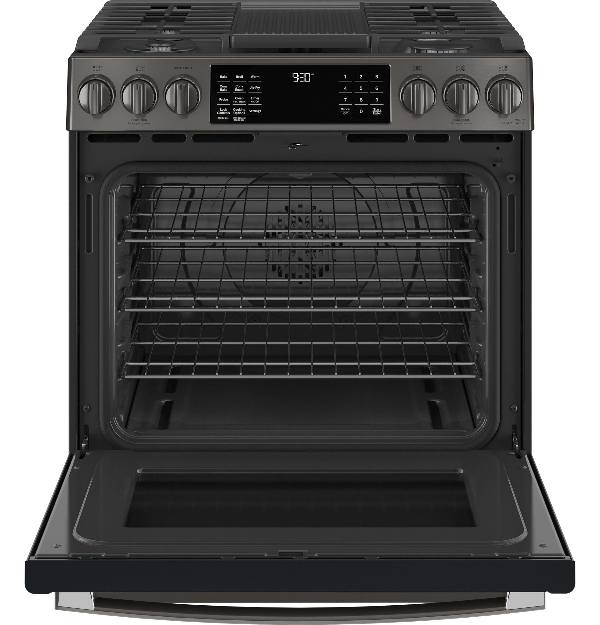 A: No Preheat Air Fry, True Convection, edge-to-edge cooktop, WiFi + SmartHQ app control, and a powerful gas burner system for precise heat.