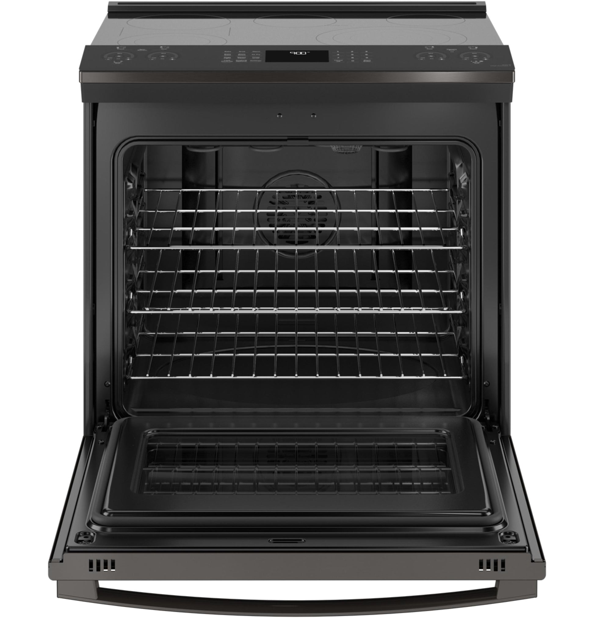 A: A 30" smart slide-in electric convection range with No Preheat Air Fry, WiFi connectivity, and a modern black stainless finish for premium cooking performance.