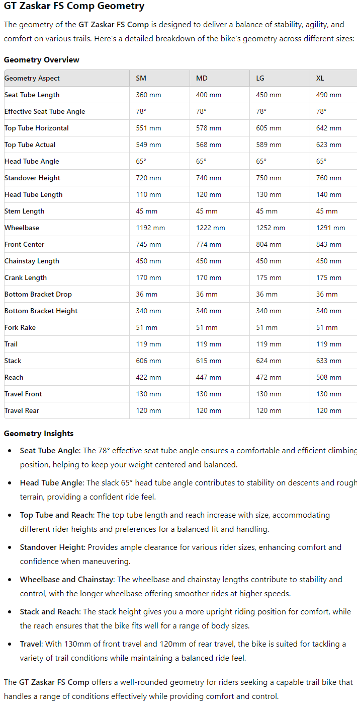 The GT Zaskar FS Comp is crafted to provide a blend of durability, performance, and affordability:
