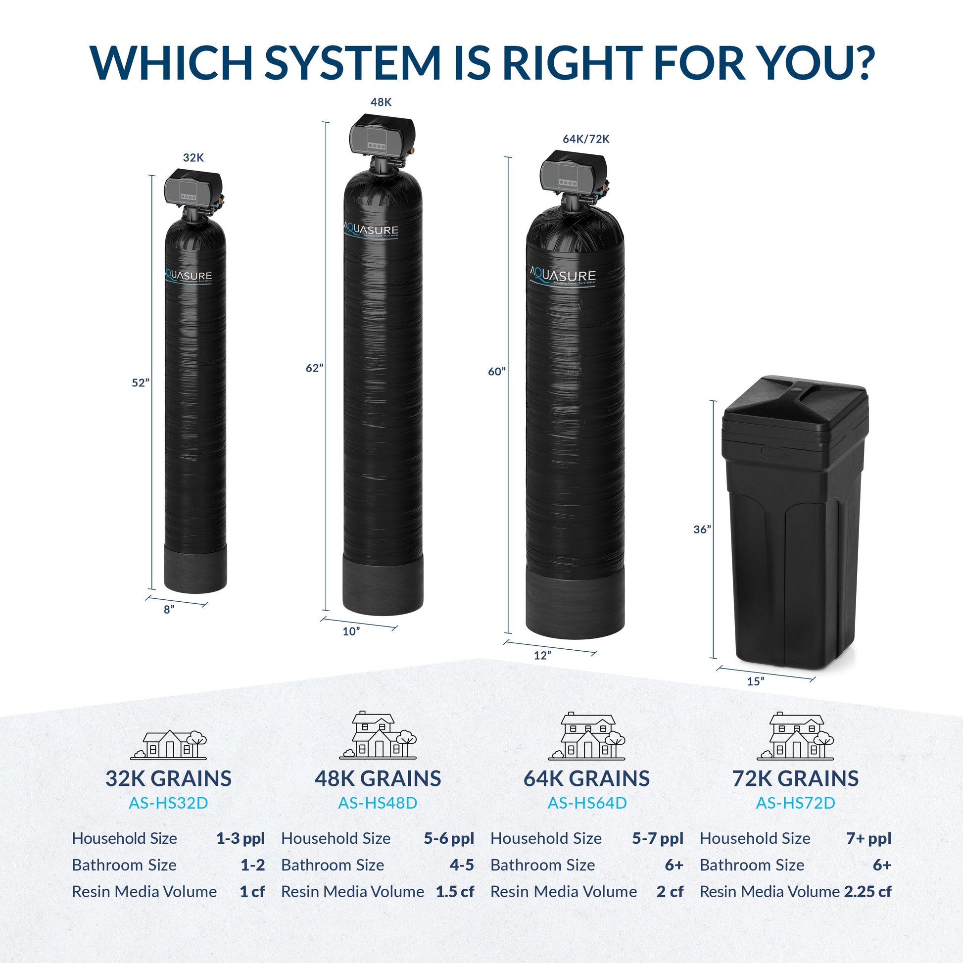 Experience the Aquasure Harmony Series 72,000 Grains Whole House Water Softener with Triple Purpose Sediment/Carbon/Zinc Pre-Filter System (AS-HS72SCZ), perfect for homes or businesses with 6+ bathrooms and 7+ people. Whether your water source is city, municipal, or well water, our system uses a highly effective ion exchange process to remove hard water minerals, delivering impeccable softened water throughout your home. Equipped with an automatic digital metered control head to ensure precise automatic backwashing and regeneration, helping you to conserve water while maintaining optimal system efficiency. Say goodbye to the negative effects of hard water, such as limescale buildup, soap scum, dry skin, and brittle hair.