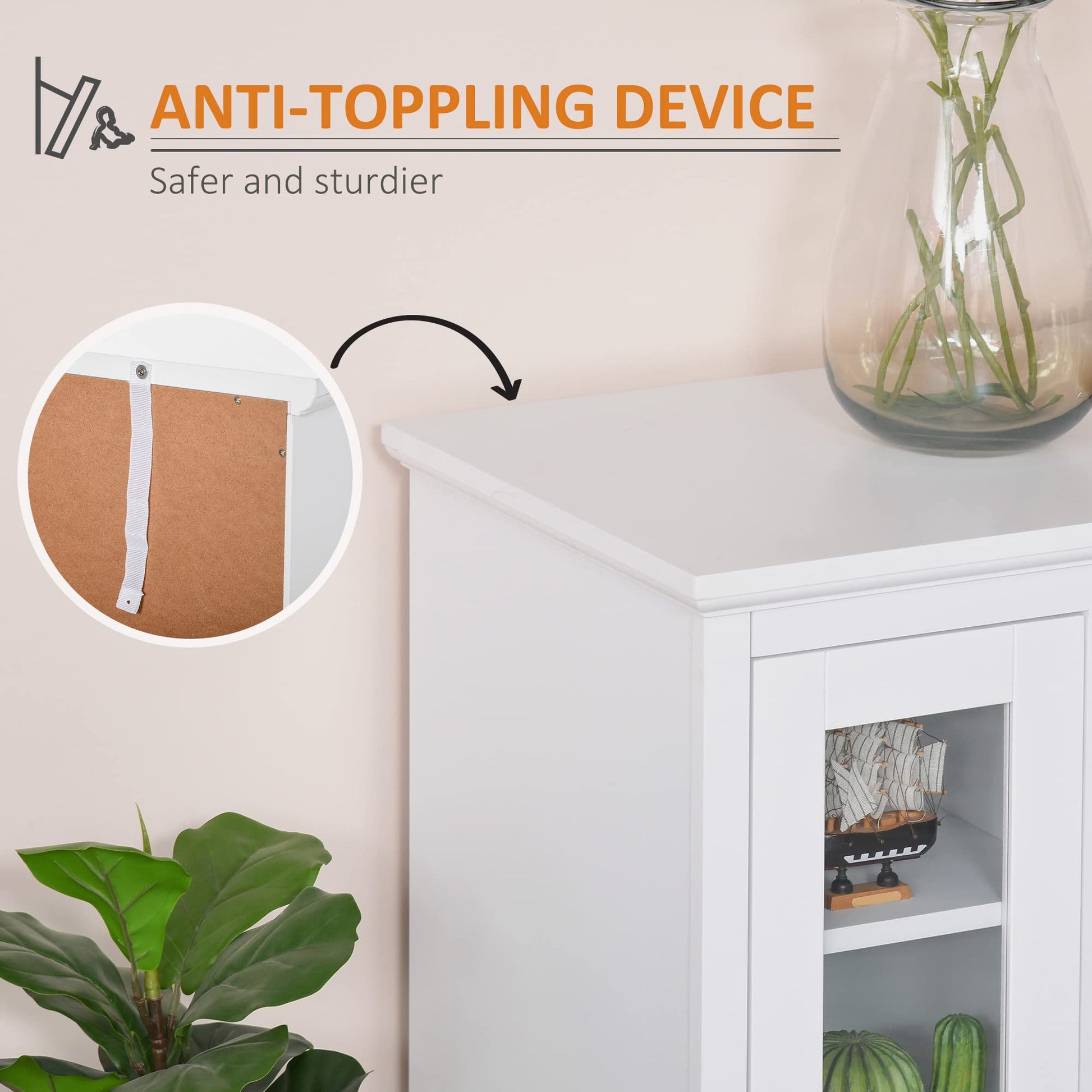 • Sturdy Frame: Made of manufactured wood material, this buffet table with storage supports up to 130lbs and the anti-toppling device adds extra stability. The framed glass doors prevent your items from getting dusty.