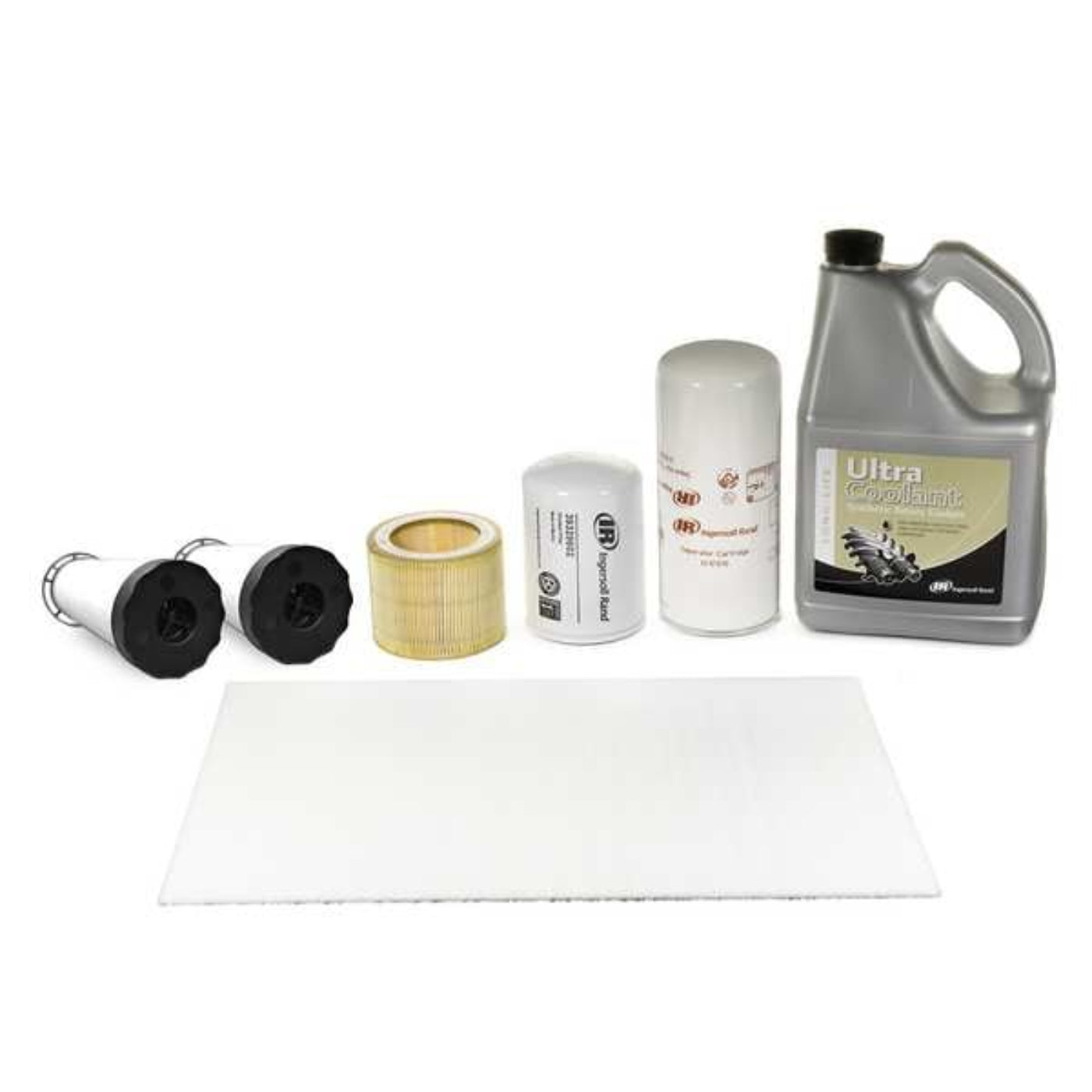 A: The kit includes an air filter element, GP and HE filter elements, oil filter element, pre-filter pad, separator element, and a 5L pail of Ultra Coolant lubricant.