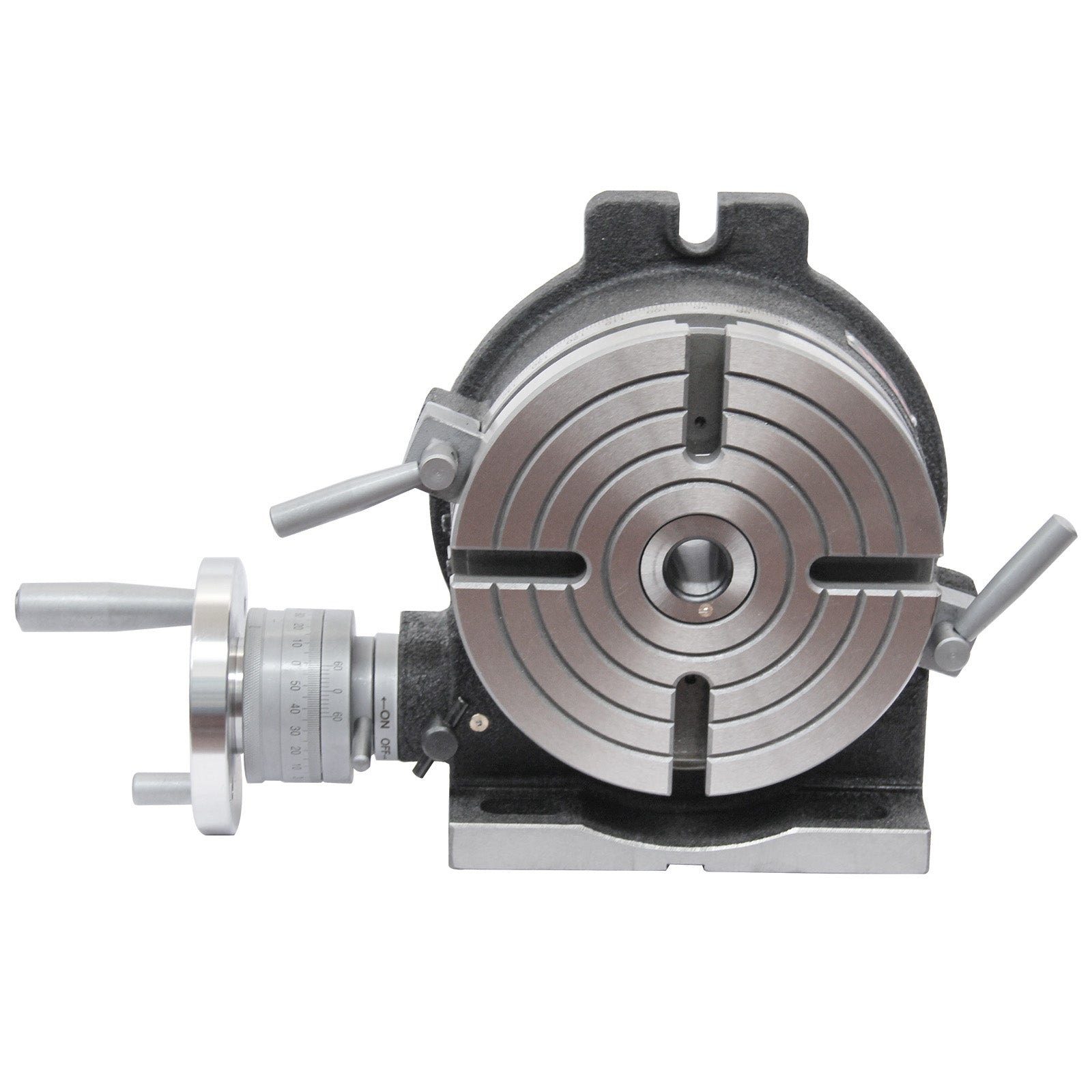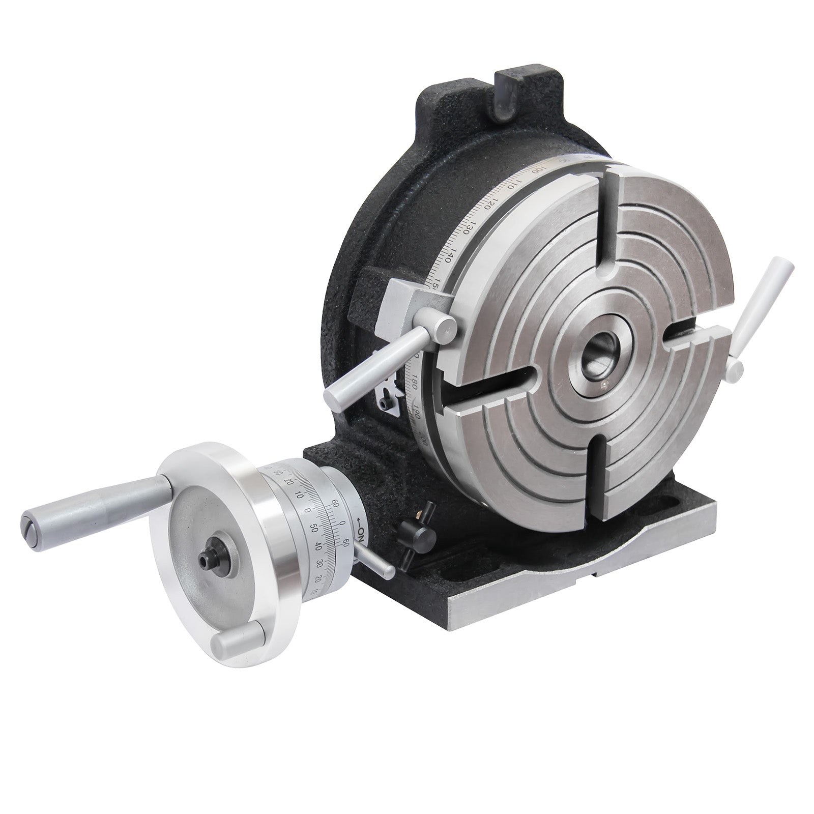 A: The rotary table has an 8-inch diameter, ideal for medium-size machining and milling applications.