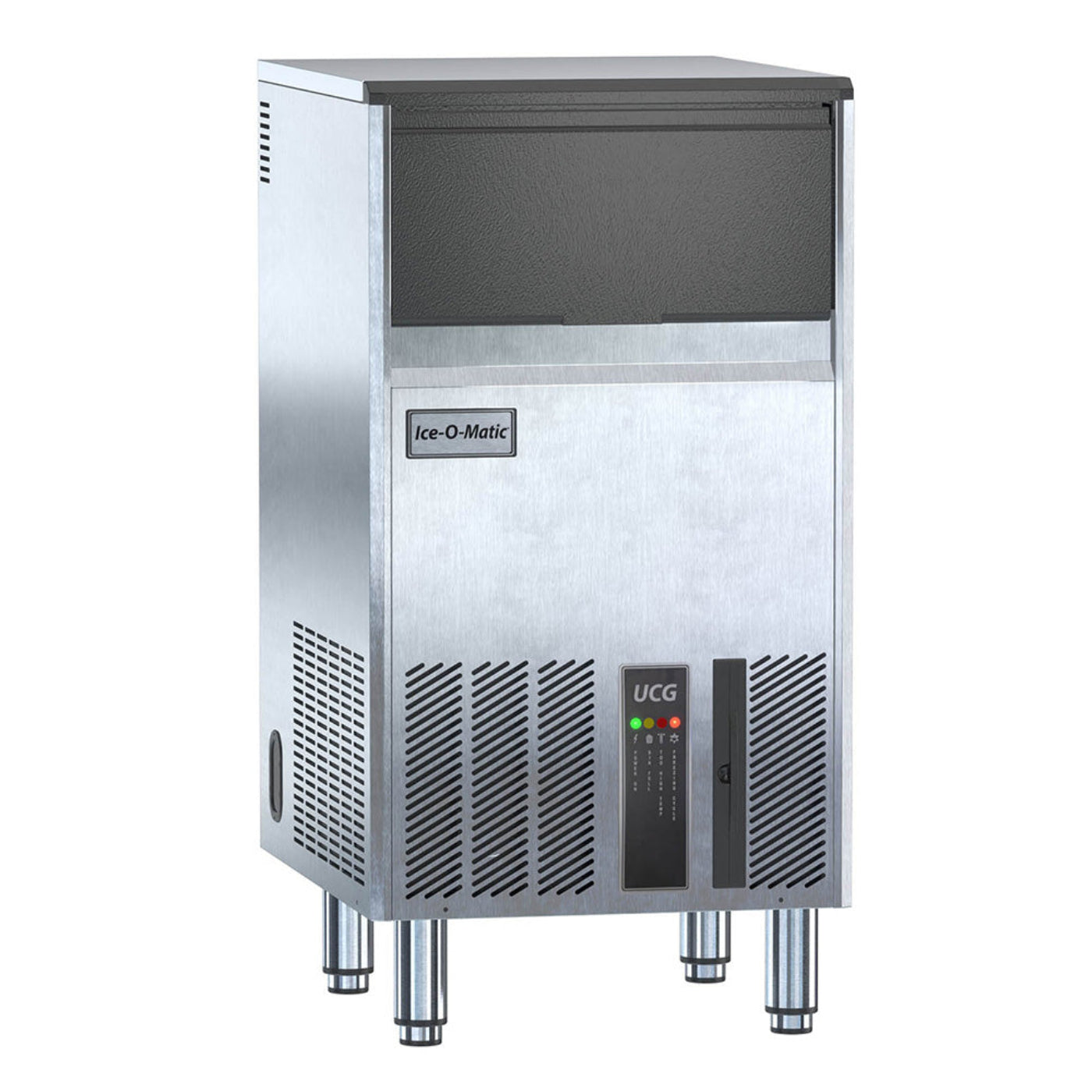 The Ice-O-Matic UCG130GA is a compact and efficient air-cooled under-counter gourmet cube ice machine, designed for commercial settings with limited space. Operating on 115V, 60Hz, and 1-phase, it fits in spaces less than 18" wide, with overall dimensions of 18.25" x 22.25" x 36". This machine produces up to 121 lbs of gourmet grande ice per day at 70°/50° and 112 lbs at 90°/70°, while its built-in bin holds 48.5 lbs of ice for easy access. Constructed with stainless steel and fingerprint-proof plastic, the UCG130GA is designed for durability and ease of cleaning. It features adjustable legs for leveling and comes equipped with an R290A Hydrocarbon refrigerant, making it more environmentally friendly. It is also ETL-Sanitation certified, ensuring it meets health and safety standards. For optimal performance, it includes a recommended IOMQS filter, making the UCG130GA an excellent choice for bars, restaurants, and cafes looking for reliable gourmet ice production.