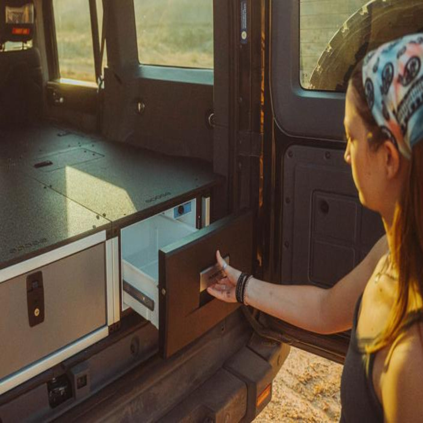 The GOOSE GEAR Explore Series Drawer Refrigerator Module with Fitted Top Plate is built specifically for the 2024–Present Ineos Grenadier (1st Gen), combining compact refrigeration storage with durable drawer functionality.