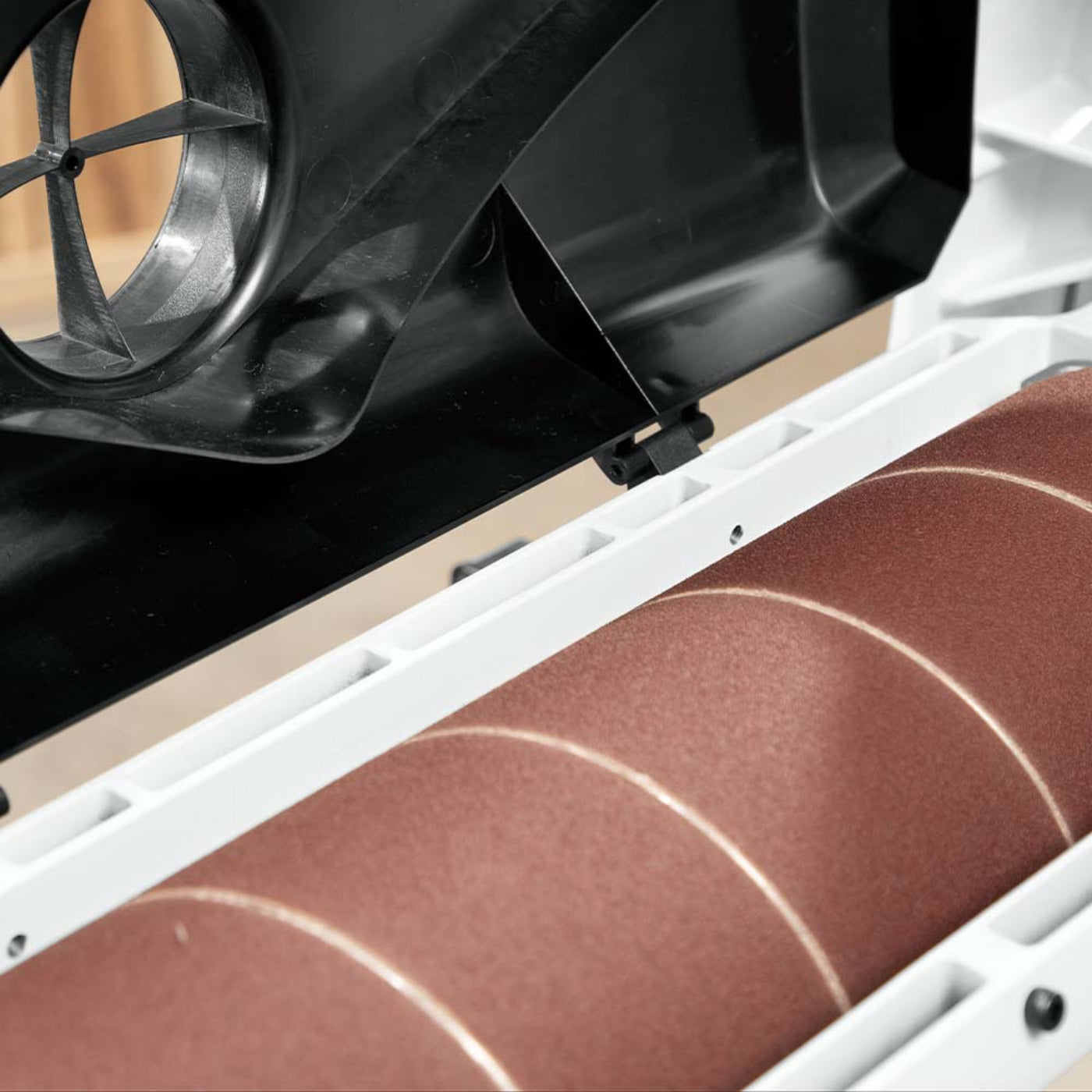 The re-designed 2244 Oscillating Drum Sander from JET has an exclusive oscillating feature that helps create the best sanding finish with the least amount of dust. When in the oscillating mode, the sanding drum head oscillates from left to right which lowers heat build-up on the sanding belt, reducing loading and burning.