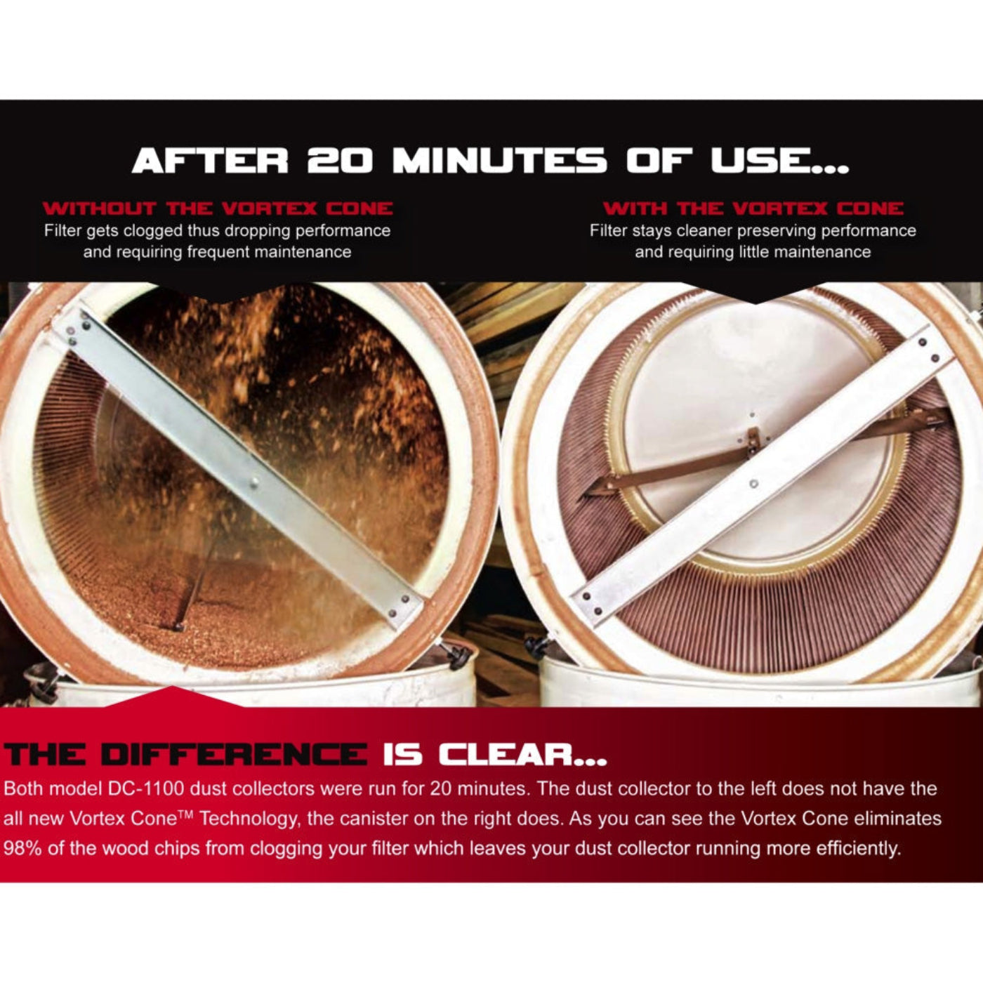 The JET DC-1100VX-5M features the exclusive Vortex Cone which improves chip separation to prevent clogging of the filter, and increases packing efficiency of the collector bag. The filter bag captures up to 98% of 5-micron particles. The high air velocity (CFM) stands up to any competitive specifications, and the industrial controls are designed for years of durable use. Collection bags have a snap ring for fast installation and removal. Casters offer maneuverability within the shop.