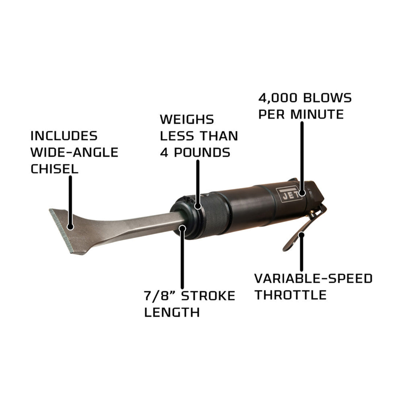 Flux Chippers are ideal for light duty and surface finish chipping such as removing slag, burrs, rust, and old paint. The JAT-820 Ball Lock Flux Chipper was made for those who change chisels on a regular basis. The ball detent lock makes switching chisels fast and easy while giving you all the power you need to get the job done.