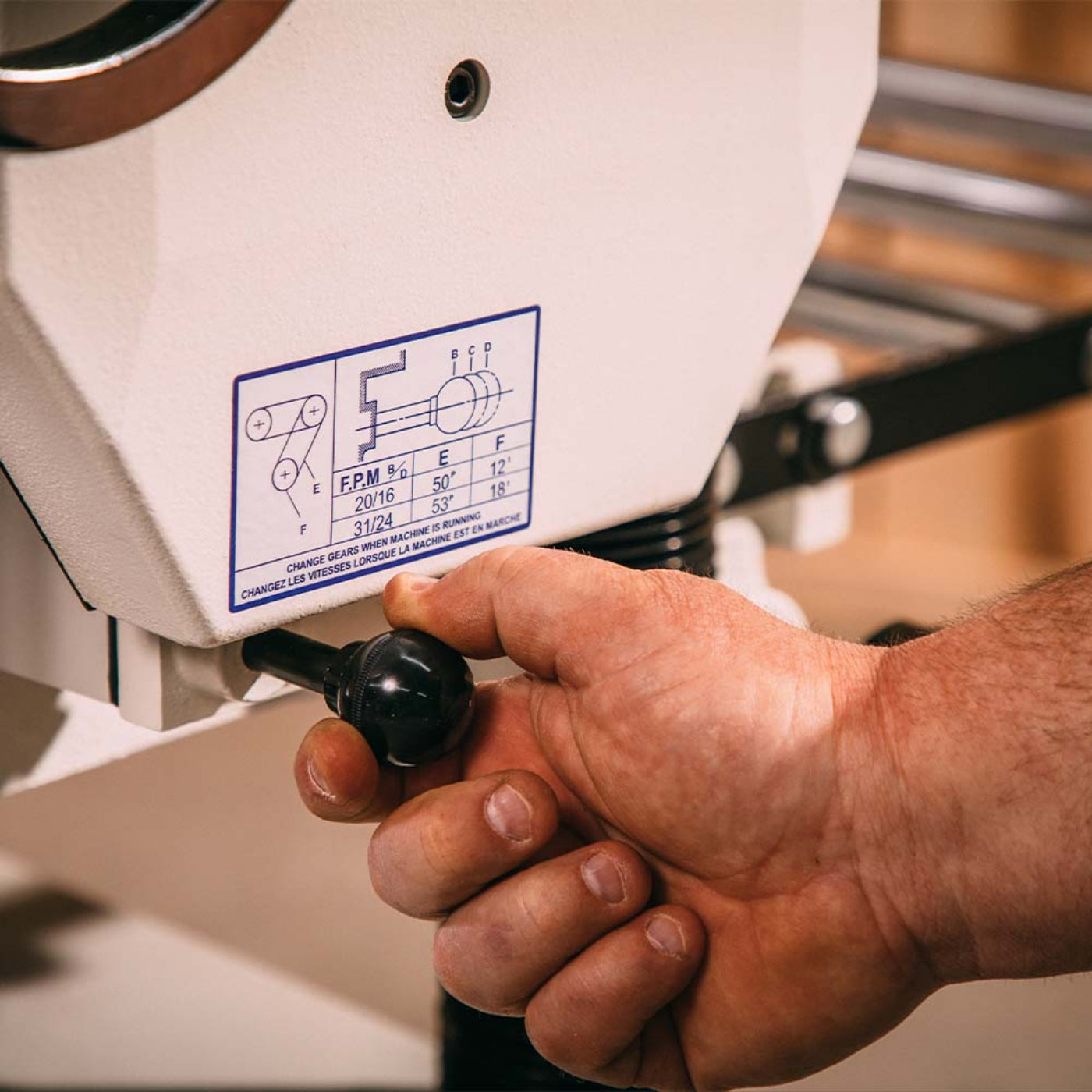 A: Dual feed rates—16 and 20 FPM—for flexibility between rough and finish cuts.