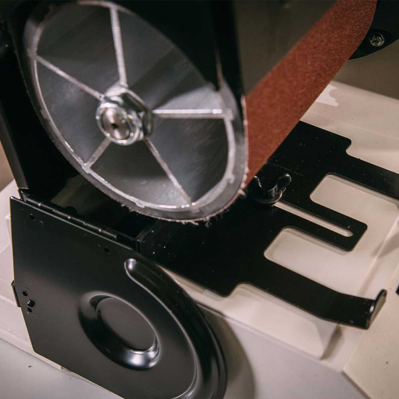 Clean dust buildup from the belt, disc, and housing after each use to prevent motor strain and fire risk.