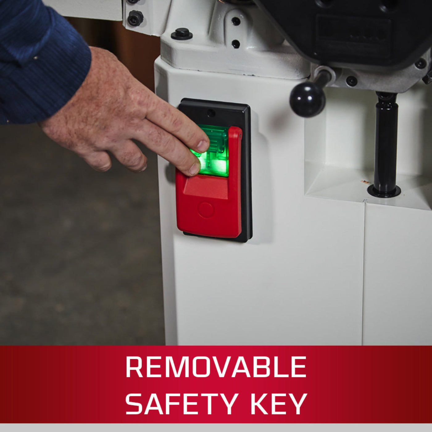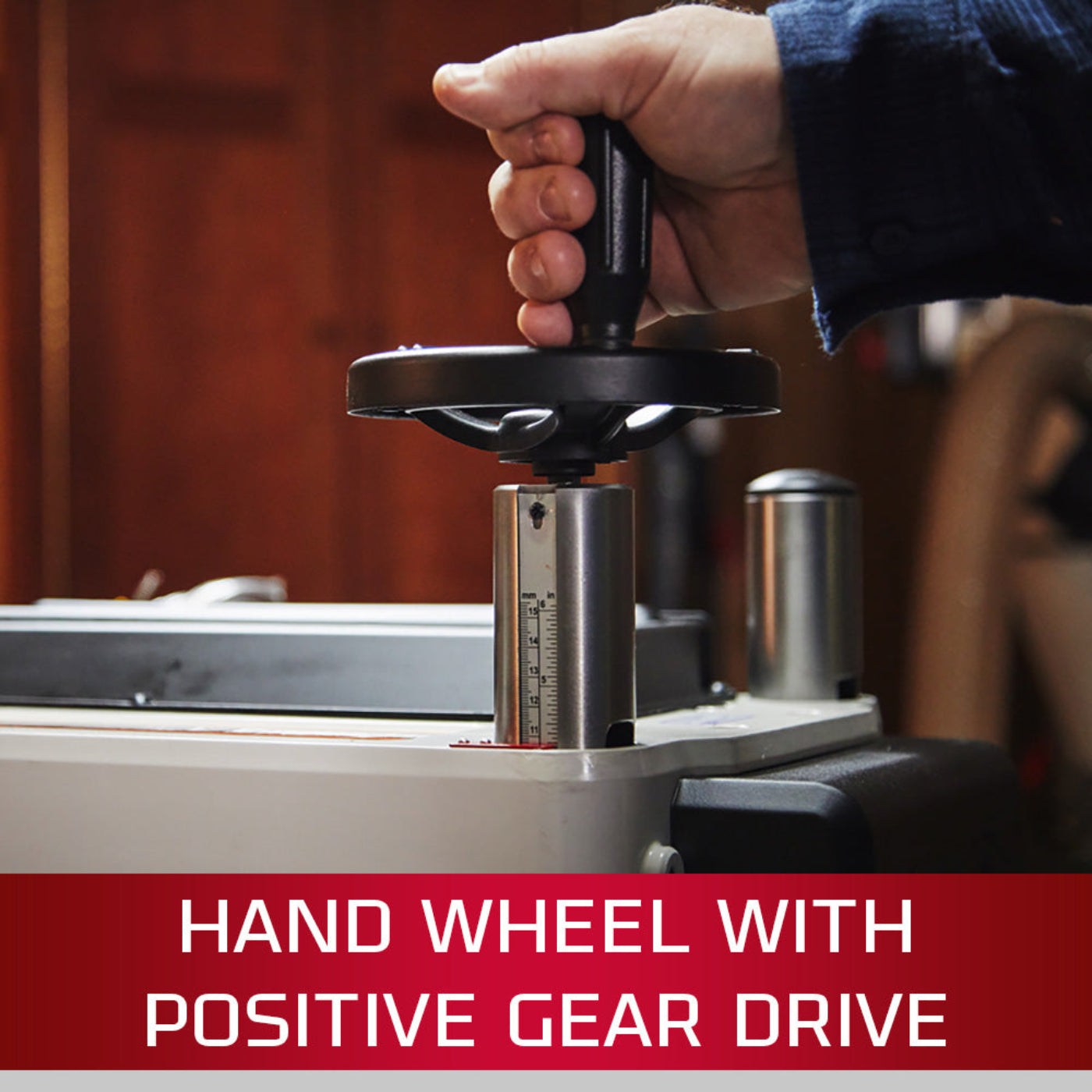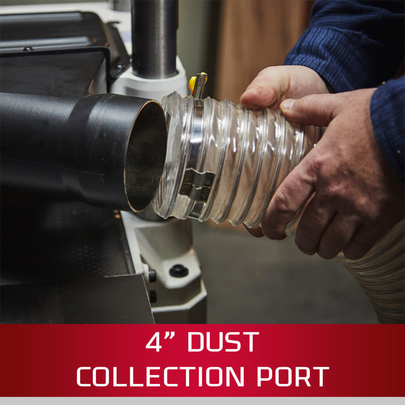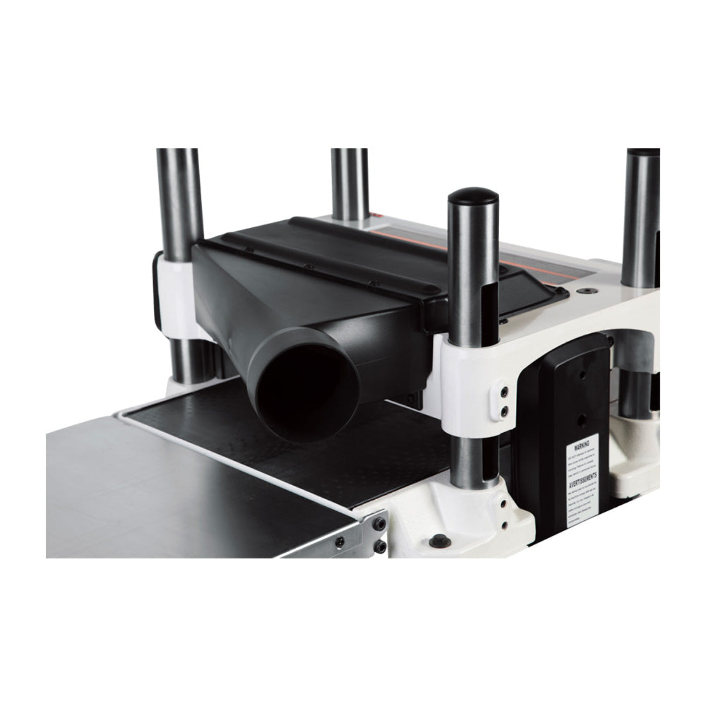 Its rock-solid table is constructed of precision ground cast iron and features steel infeed/outfeed table extensions which provides support for larger work pieces that conveniently fold out of the way. And because even the coolest power planer is one of the messiest machines on the planet, JET's angled 4" dust port keeps your dust hose out of the way for easy hookup on your shop's dust collection system.