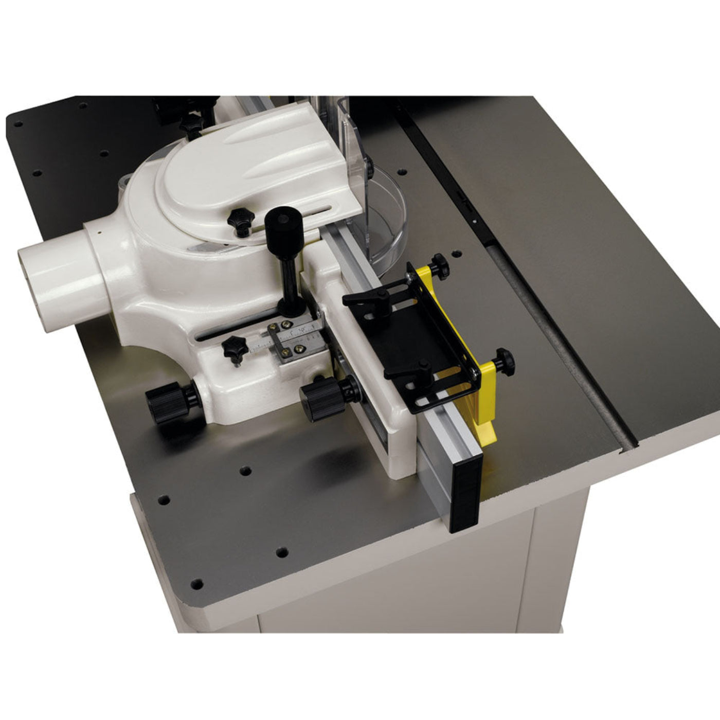 The JET JWS-35X Shaper features a spacious 26-3/4" x 32-1/4" precision-ground cast iron table. Pre-drilled and tapped holes on the rear table corners are ready to mount most s on either side of the cutter. A full-sized 3/4" x 3/8" T-shaped miter slot on the table accepts the included miter gauge. This standard sized slot also accepts common aftermarket tooling and shop-made jigs.