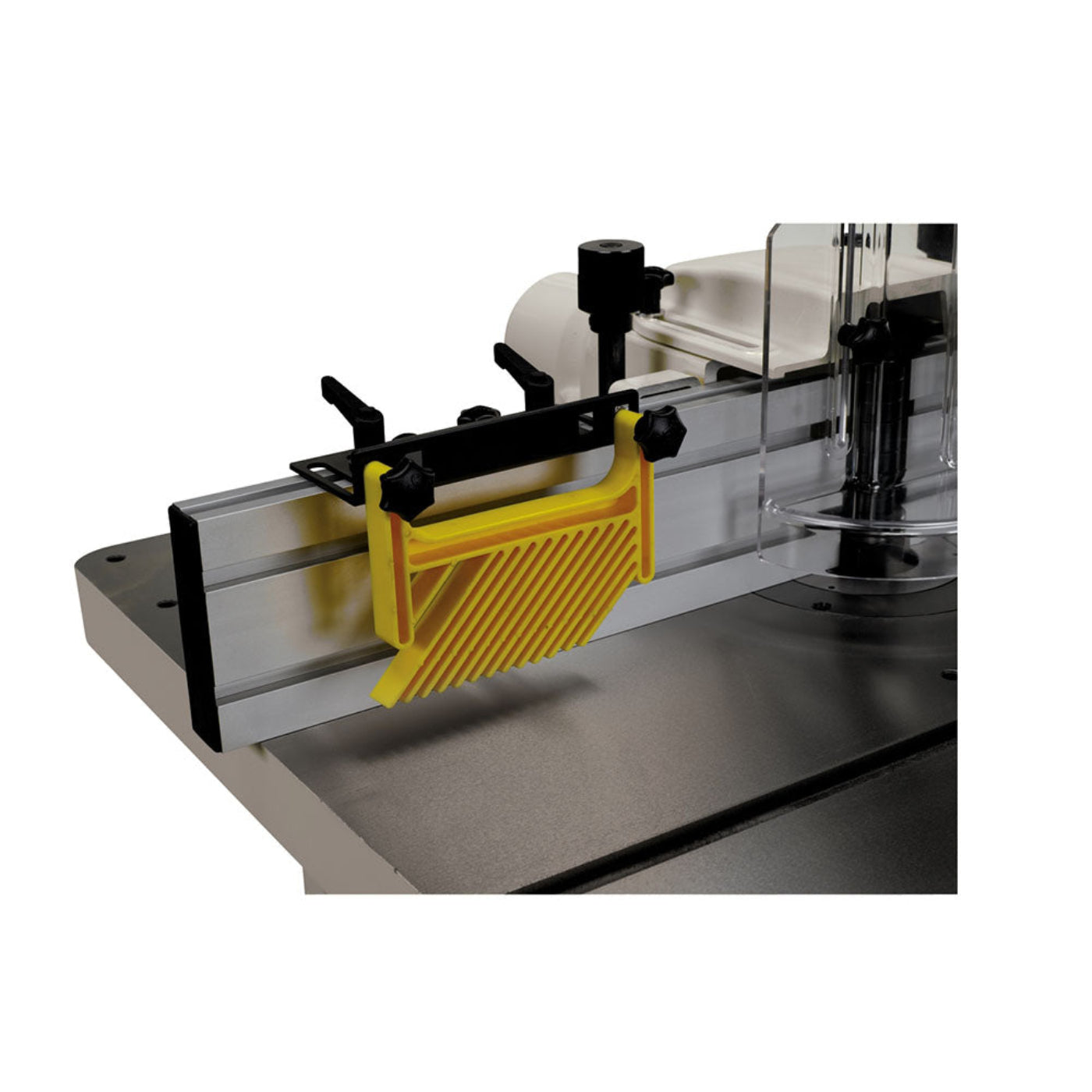 A large, solid fence system with fully adjustable left and right face halves gives you the stability and control for precision work. The fence faces are infinitely adjustable on their mounts and are each secured with a single finger-operated knob. Both extruded aluminum faces have grooves in them that make attaching wooden faces or the included feather boards easy and secure. The left fence half has a micro adjuster (front to back) for setting up ultra precise jointing operations. A gauge at its adjusting knob helps set the precise amount of offset desired for your jointing operation.