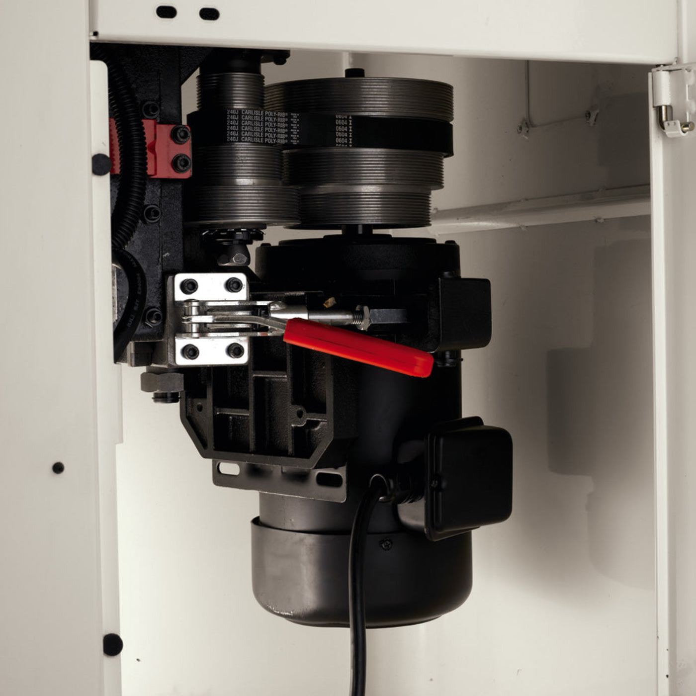 There are four spindle speeds on the JWS-35X: 4000, 6000, 8000, and 10,000RPM. The speeds are generated by a set of precisely machined stepped pulleys on the motor and spindle shaft. The shaper connects the pulleys with a Poly-V-belt, known for smooth power transmission, resistance to slipping and low heat buildup.