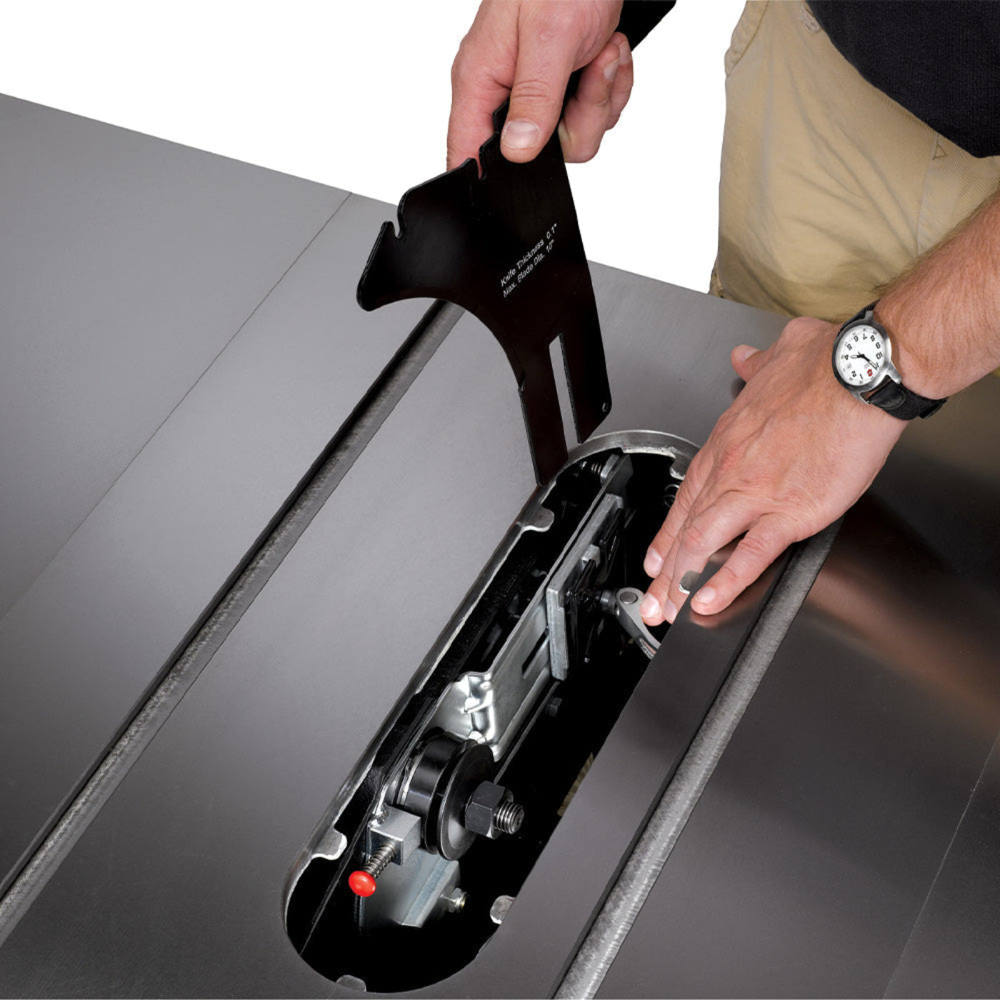 The JET Deluxe XACTA Saw features a quick-release riving knife and an integrated push button arbor lock that keeps the operator safe. Heavy-duty, chrome-plated handwheels provide smooth trunnion/arbor movement. The independent leaf safety guard protects the operator from the blade while cutting, even at a 45° tilt.