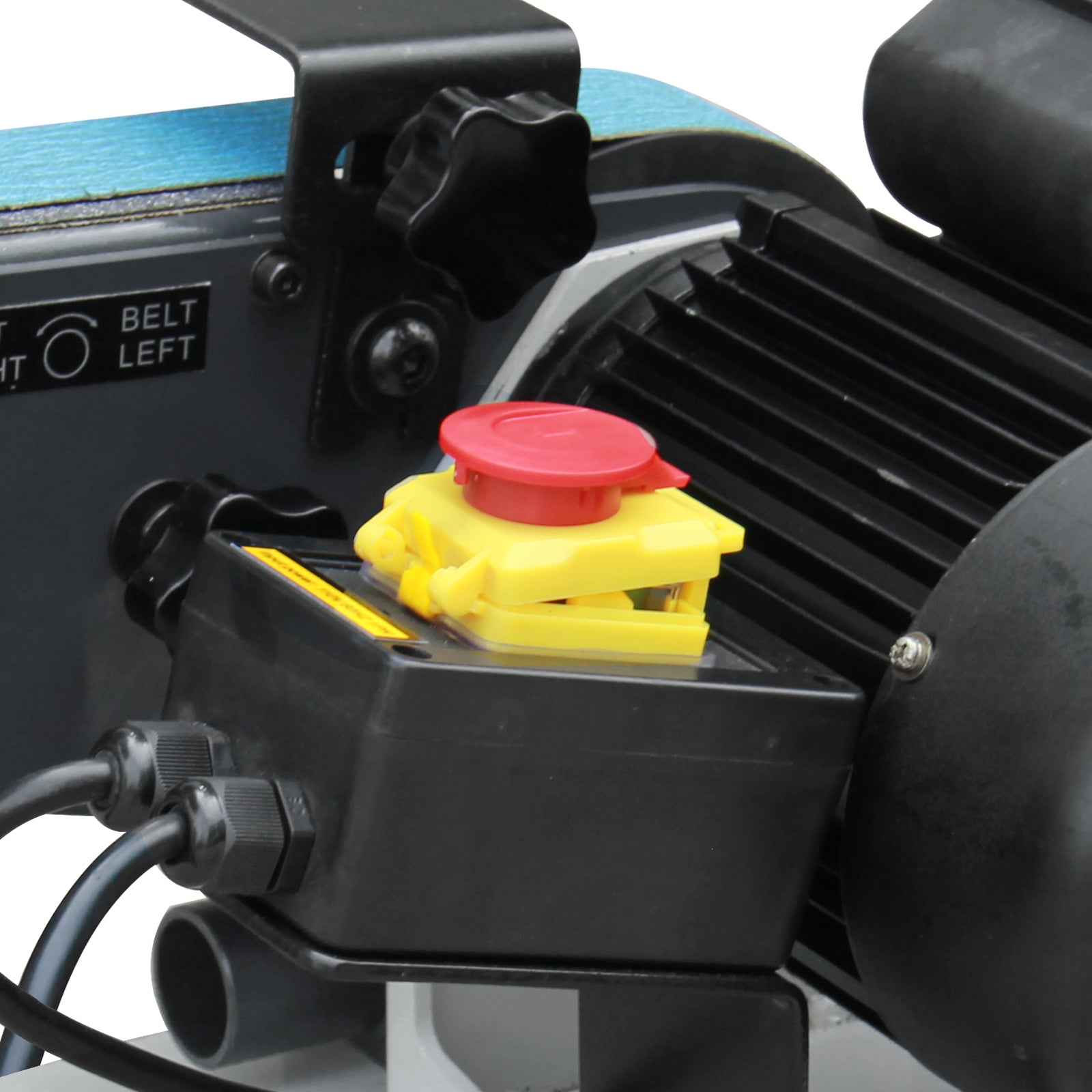 The quick-release lever allows for quick and easy replacement of worn-out belts, ensuring continuous operation and versatility with different grit sizes. The machine also includes safety guards, emergency stop buttons, and other features to protect the operator from accidents and injuries.