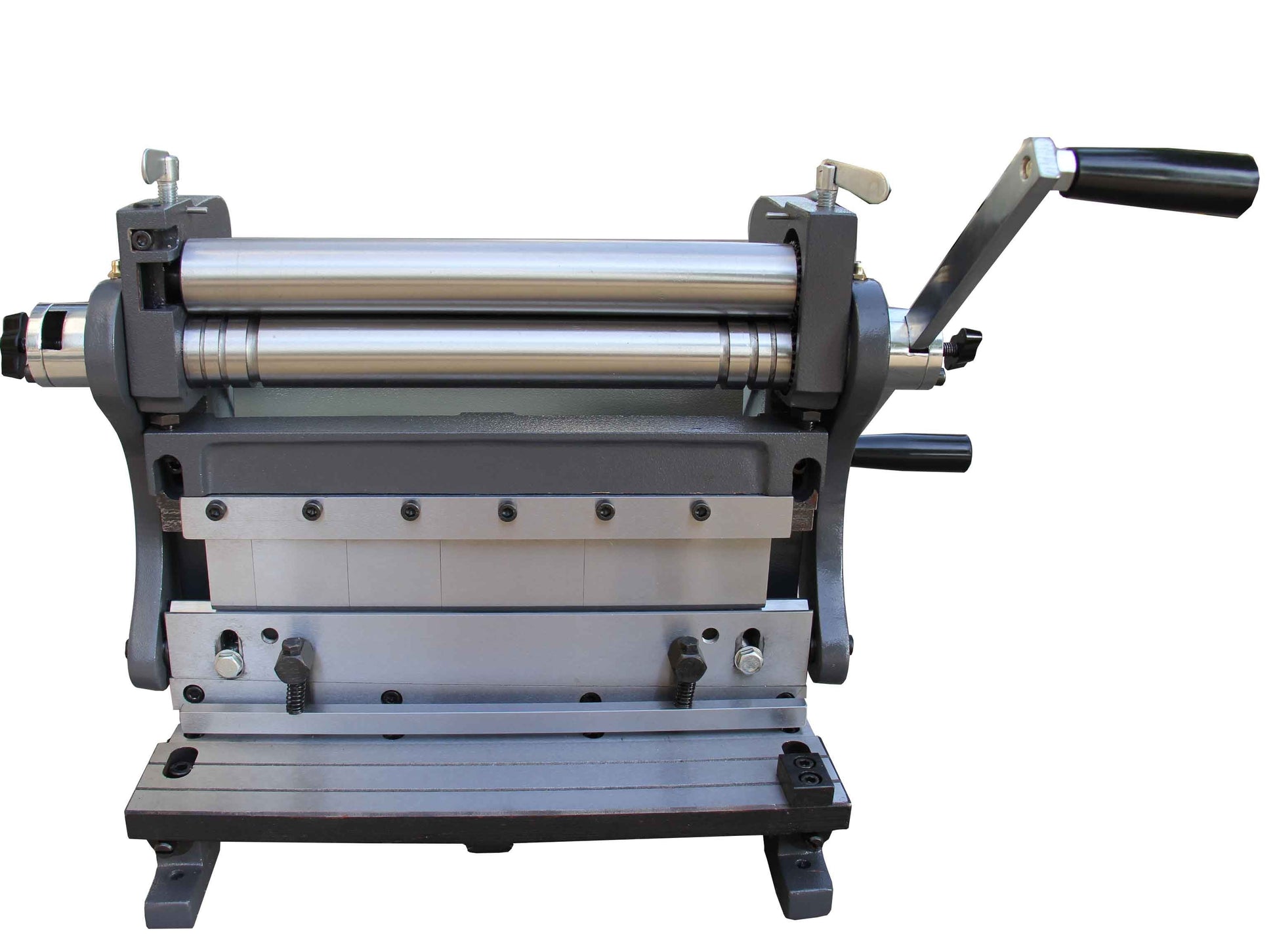 KAKA Industrial 12 Inch smart 3-IN-1 machine is designed to cut, brake and roll at the same time. It equips with the combination of shear, press brake and roll. The shear makes straight cuts up to 12" while the press brake can bends to 90 degrees of material up to 12" wide. The combination machine of shear, press brake and roll applied adjustable finger dies for pans and boxes. It is a smart choice for any metalworking shop.