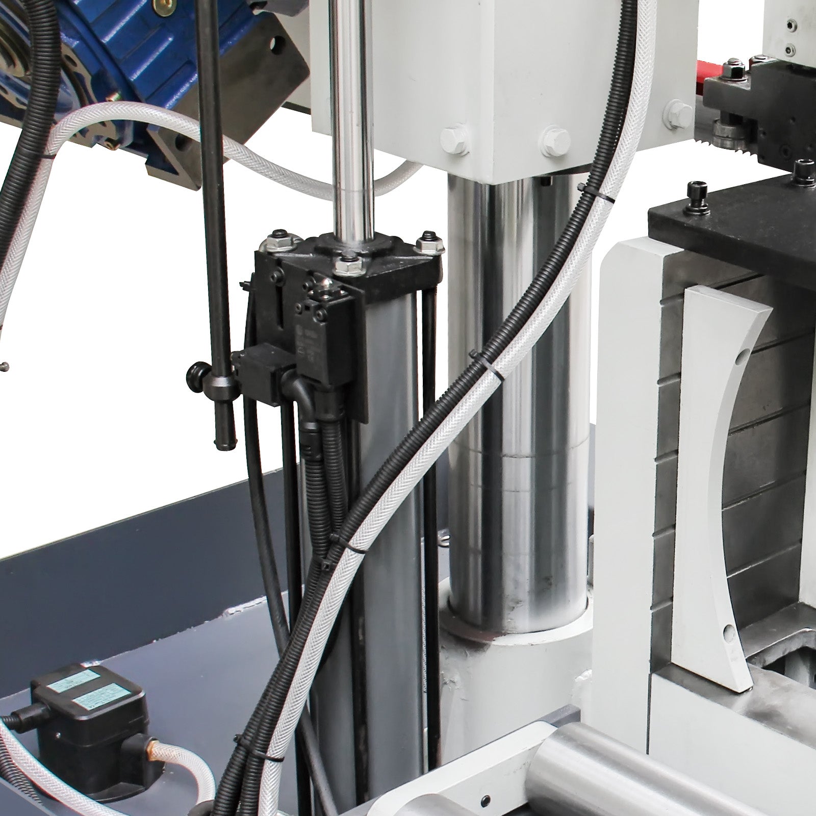 A: Uses hydraulic-controlled feed for consistent cutting.