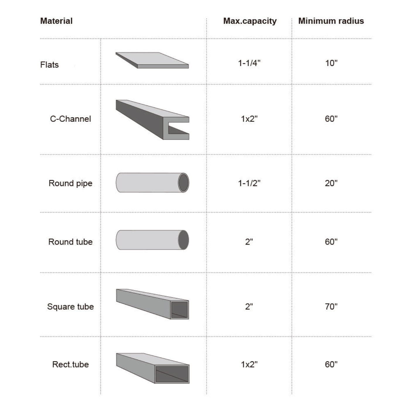 Bend 1-1/2" Schdule 40 pipe to minimum radius of 20" and 2" round tube to a mnimum radius of 60"