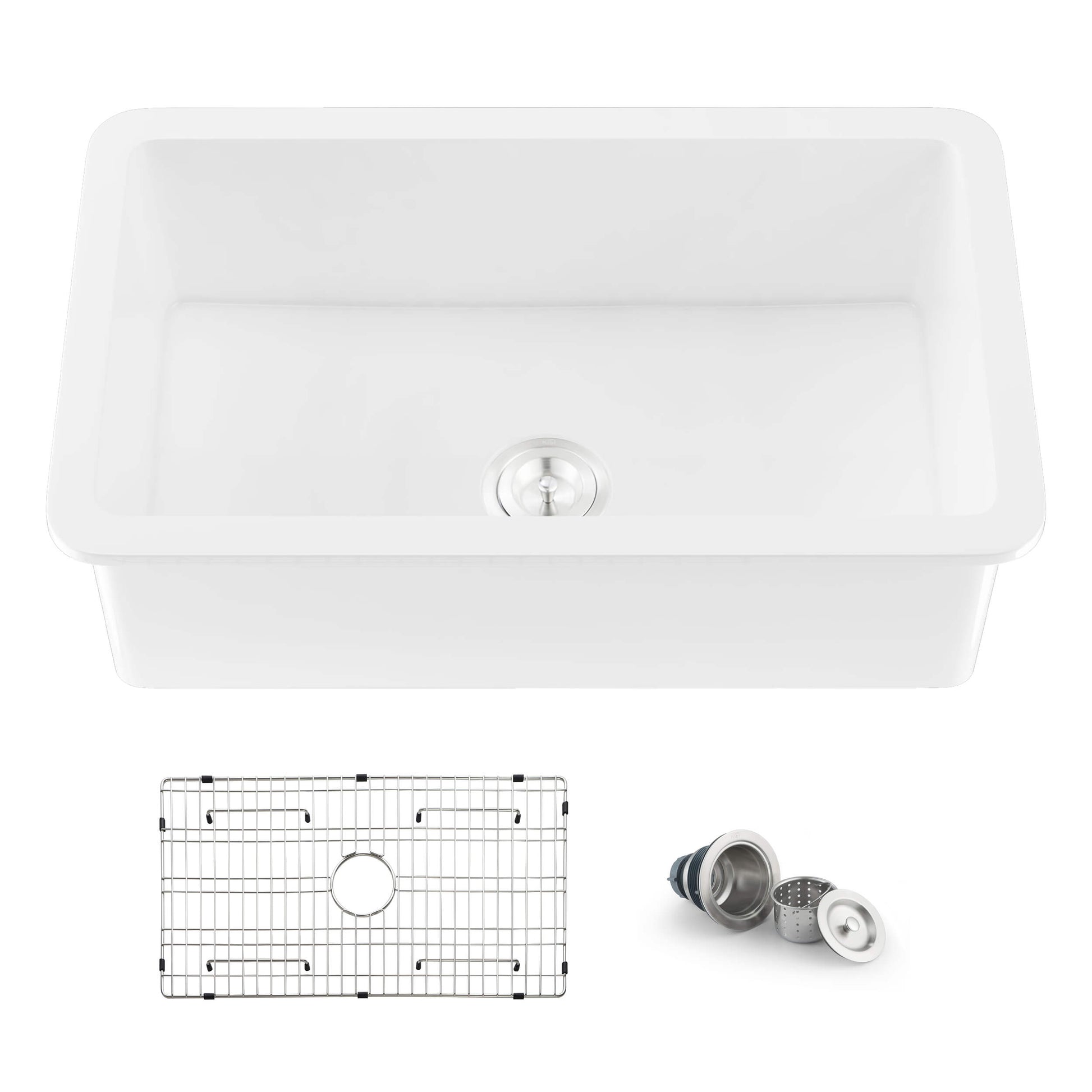 A: This sink is crafted from durable fireclay, which is known for its strength and resistance to stains, scratches, and chips. The 32" x 19" x 10" size offers ample space for washing large items, and its glossy white finish enhances the sink’s visual appeal. The undermount design ensures a seamless look under your countertop.