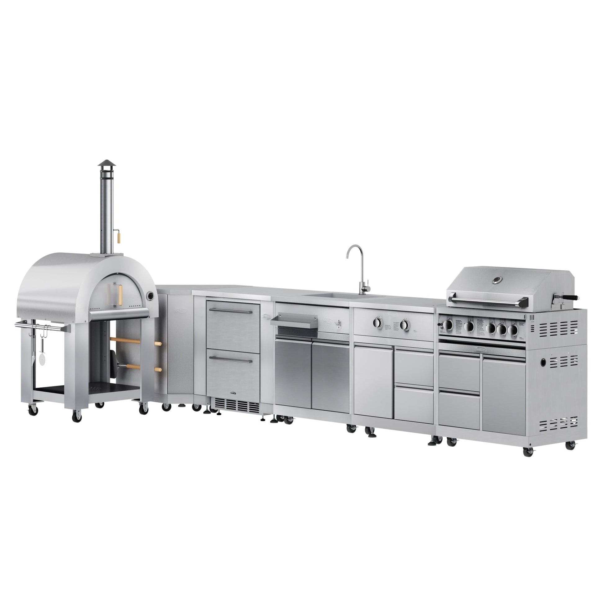 A: A stainless-steel outdoor kitchen featuring a wood fire pizza oven, 30 in. BBQ grill, side burner, sink, corner cabinet, refrigerator, and storage cabinets.