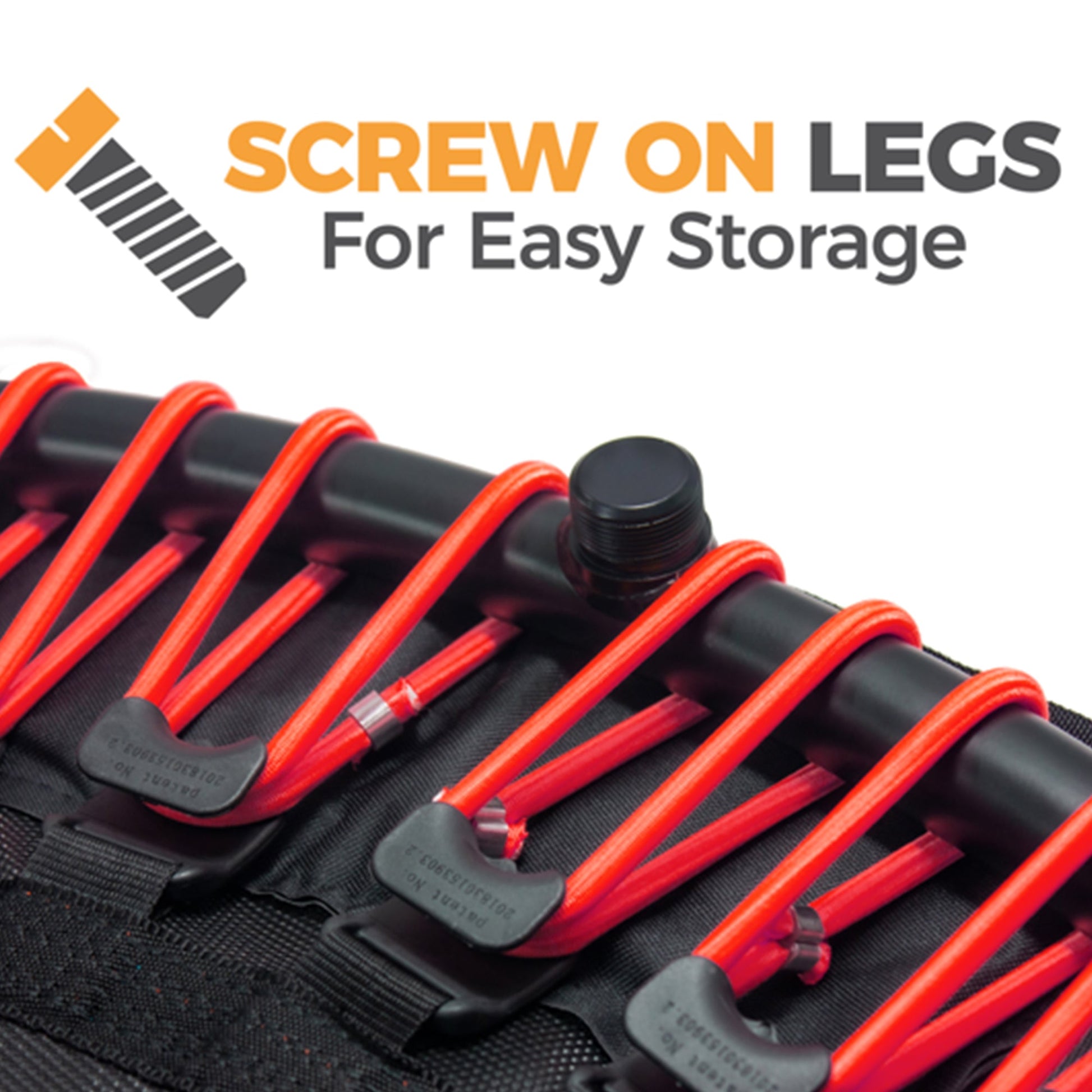 - Attach the bar to any 2 trampoline legs for simple assembly by slipping around the legs and reattaching the legs