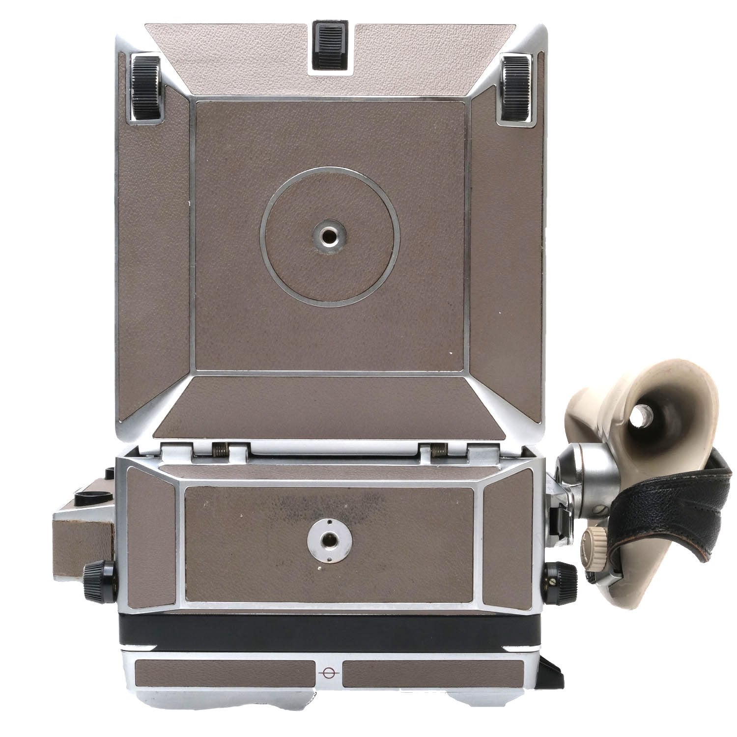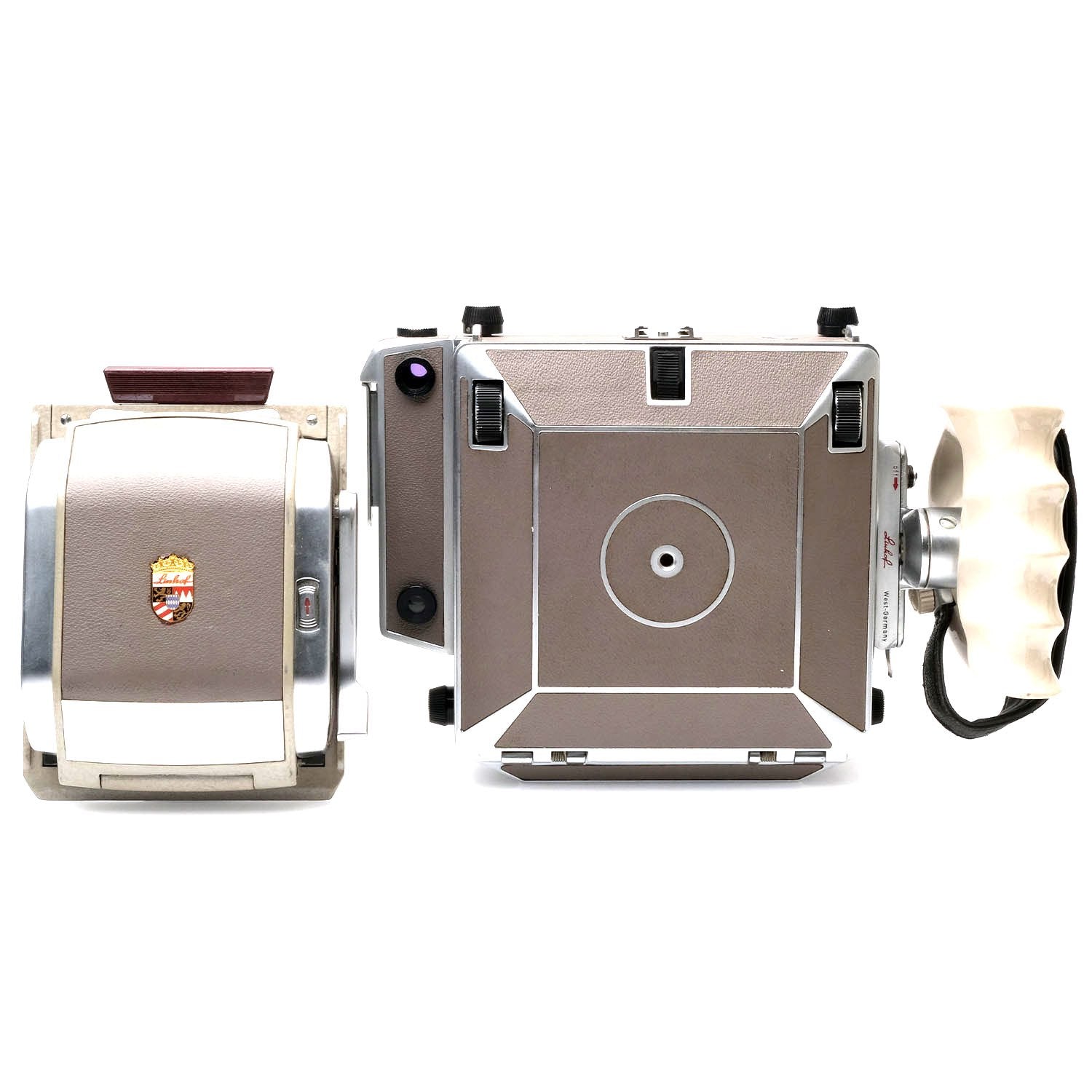 This Linhof 4x5 Technika V (Tan), #81736, is in great condition with minor handling wear. I rate it cosmetically a (9). The camera is in proper working order and ready to be used; all of the components loosen & tighten and have a full range of motion. The focusing screen is clear and the bellows is not deteriorating. The releases on the back to remove the focusing screen and mount a film back are loose. They can still be used to lock a focusing screen/film back in place, but the switches themselves can fall off. The included Schneider-Kreuznach 150mm f5.6 Symmar lens, #9757389, is in similar condition, also rated a (9). It has coverage up to 4x5", a 70-degree angle of view, and a 210mm image circle at f22. The glass is clean and clear with no haze, marks, or fungus. There are a few faint specks of dust inside, but they do not affect image quality. A matching cam is included. The included Linhof shutter is also rated a (9). The shutter speed wheel is smooth, but the aperture lever is a bit stiff. The shutter is accurate at all speeds and the aperture functions properly, but there's some faint oil on the blades. It includes a Linhof lens board. This camera also includes a left handed anatomical grip and a Super Rollex 120 film back. Please refer to the photos for details.