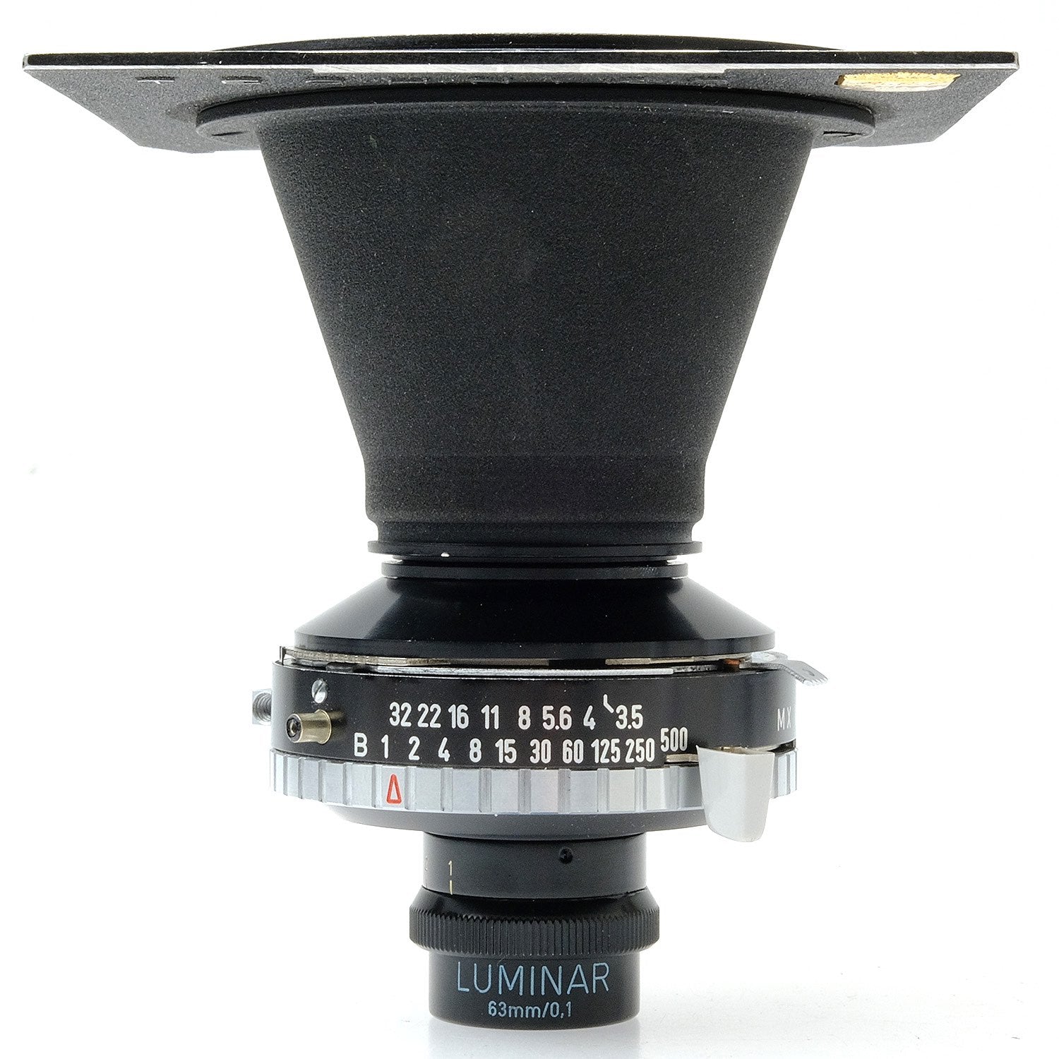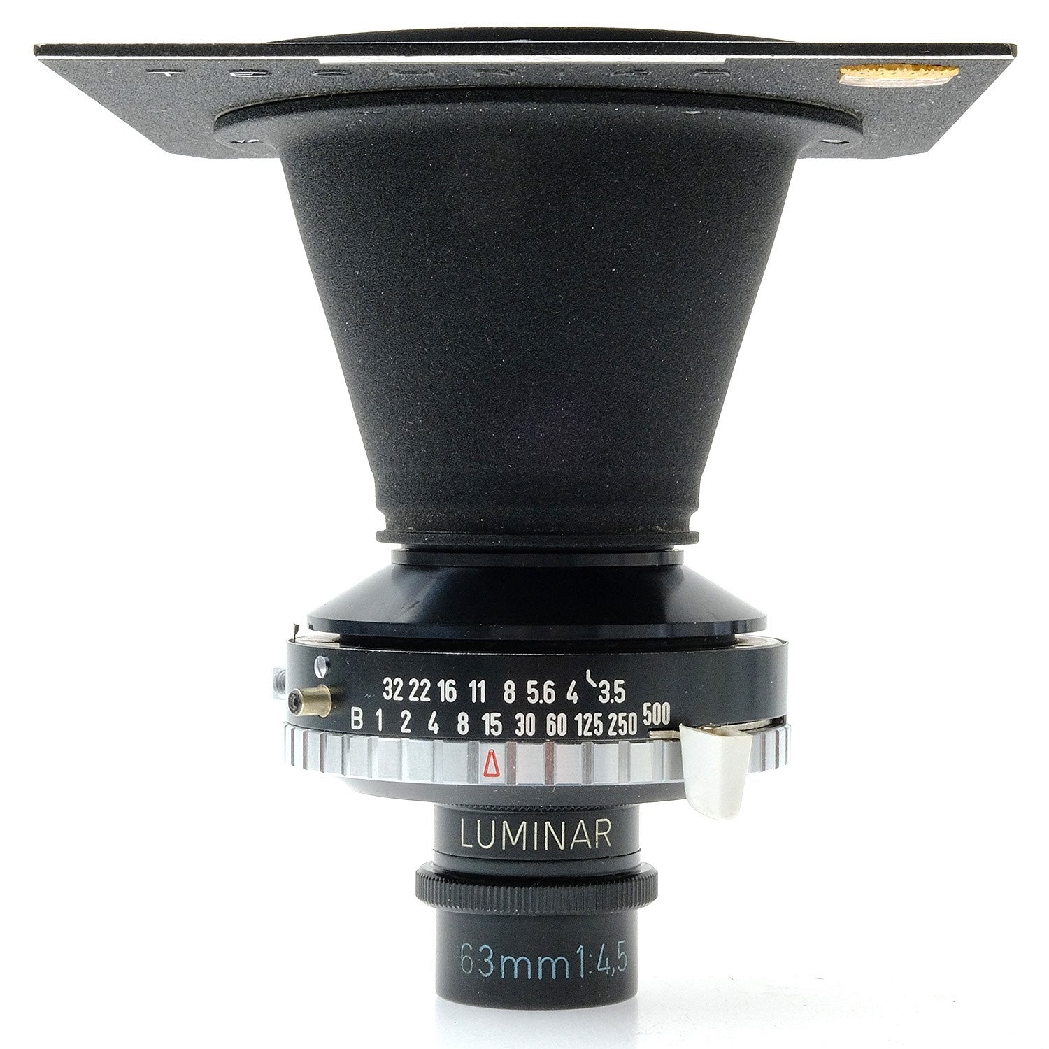 A: The Linhof 63mm f/4.5 Luminar is a wide-angle lens for large-format cameras, featuring a Synchro Compur shutter and mounted on a board for easy integration with compatible cameras.