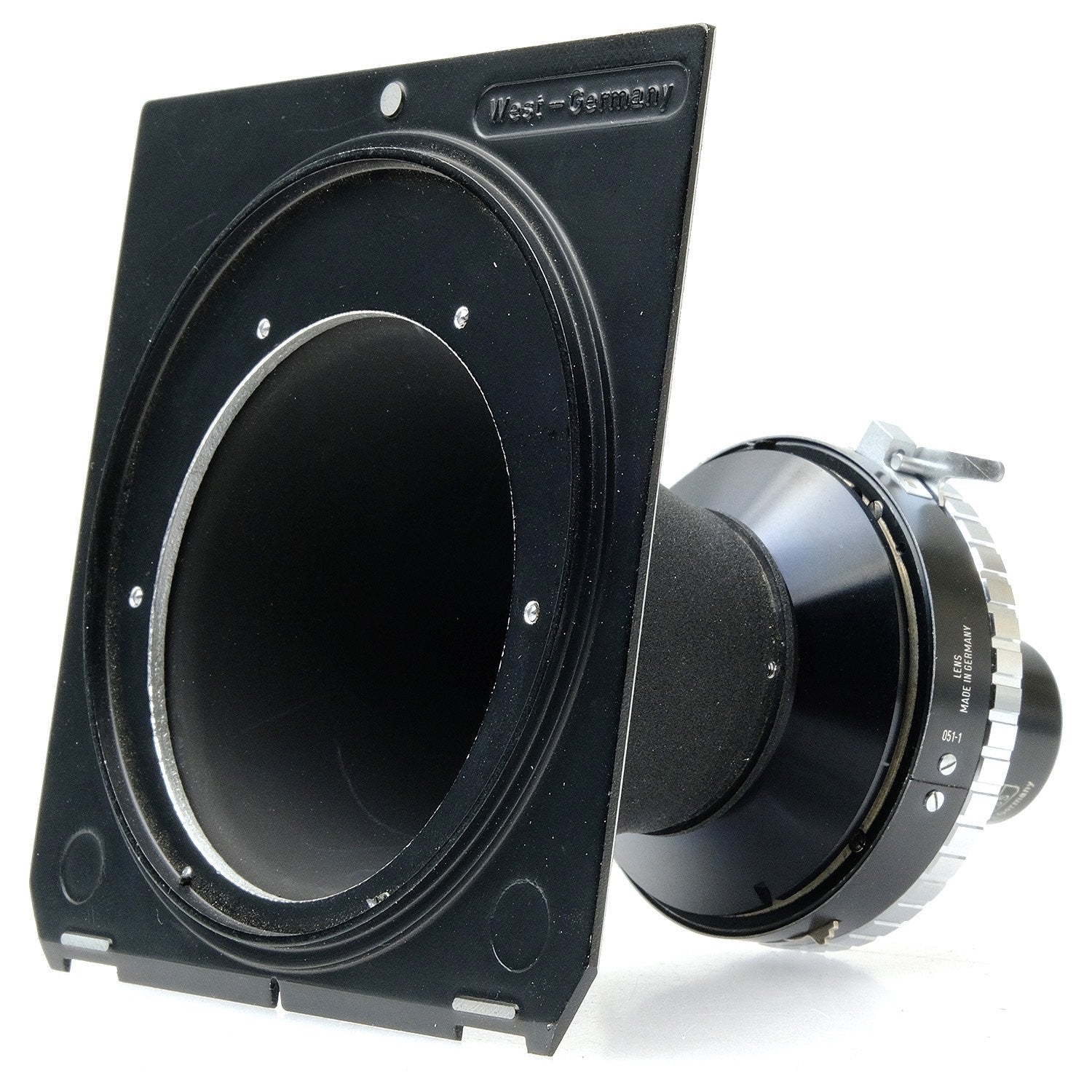 This Zeiss 63mm f4.5 Luminar Macro Lens, #4788552, is in great condition with minor handling wear. I rate it cosmetically a (9+). The aperture ring is very stiff, but the aperture functions properly and the glass has no fungus. There are some faint marks, some faint haze, and specks of dust inside. It has coverage up to 4x5" and optimized magnification between 2x & 10x. The included Linhof Synchro-Compur shutter is in similar condition, also rated a (9+). The shutter speed ring is smooth, but inaccurate at speeds below 8. This lens includes a flared retaining ring and a Linhof Technika conical lens board. Please refer to the photos for details.