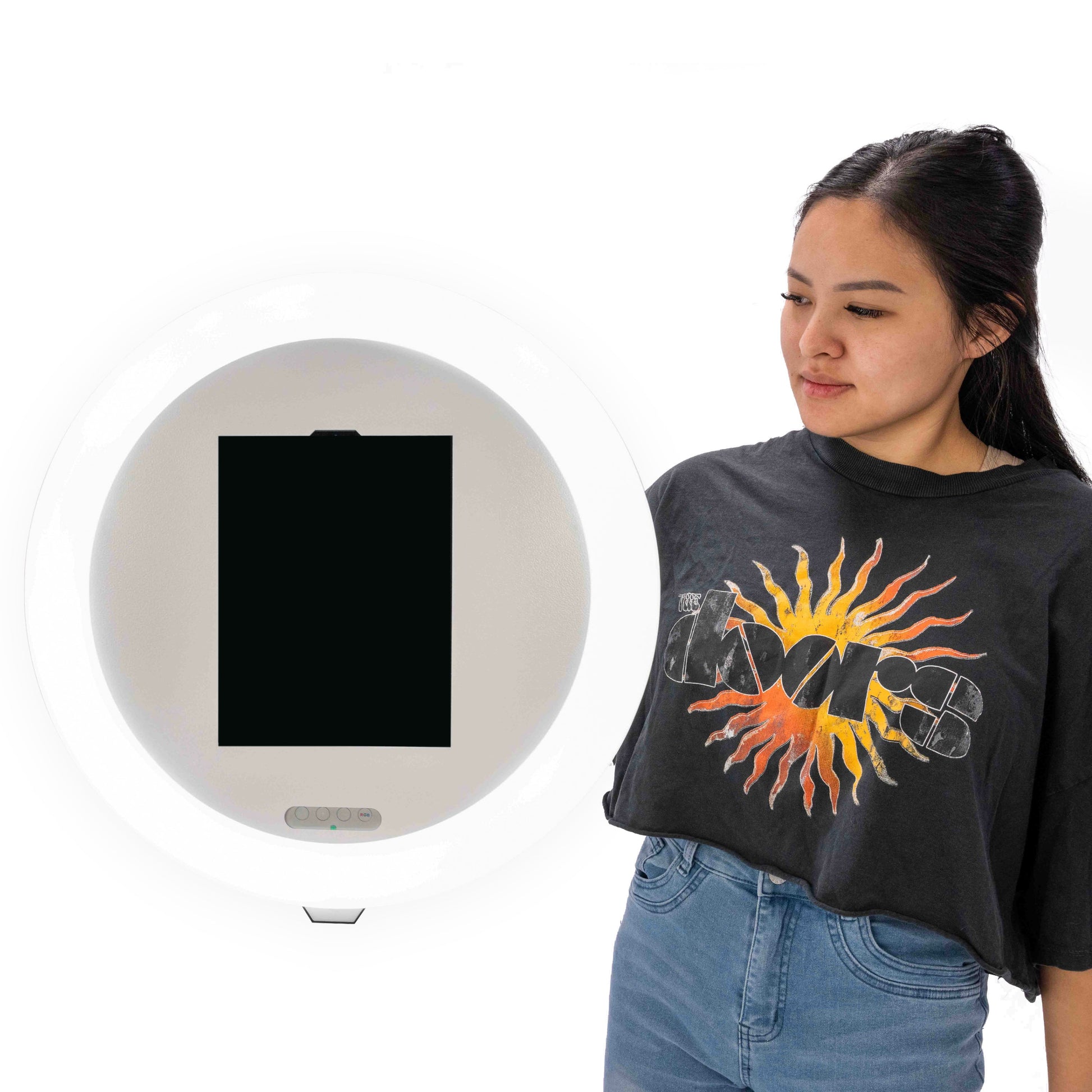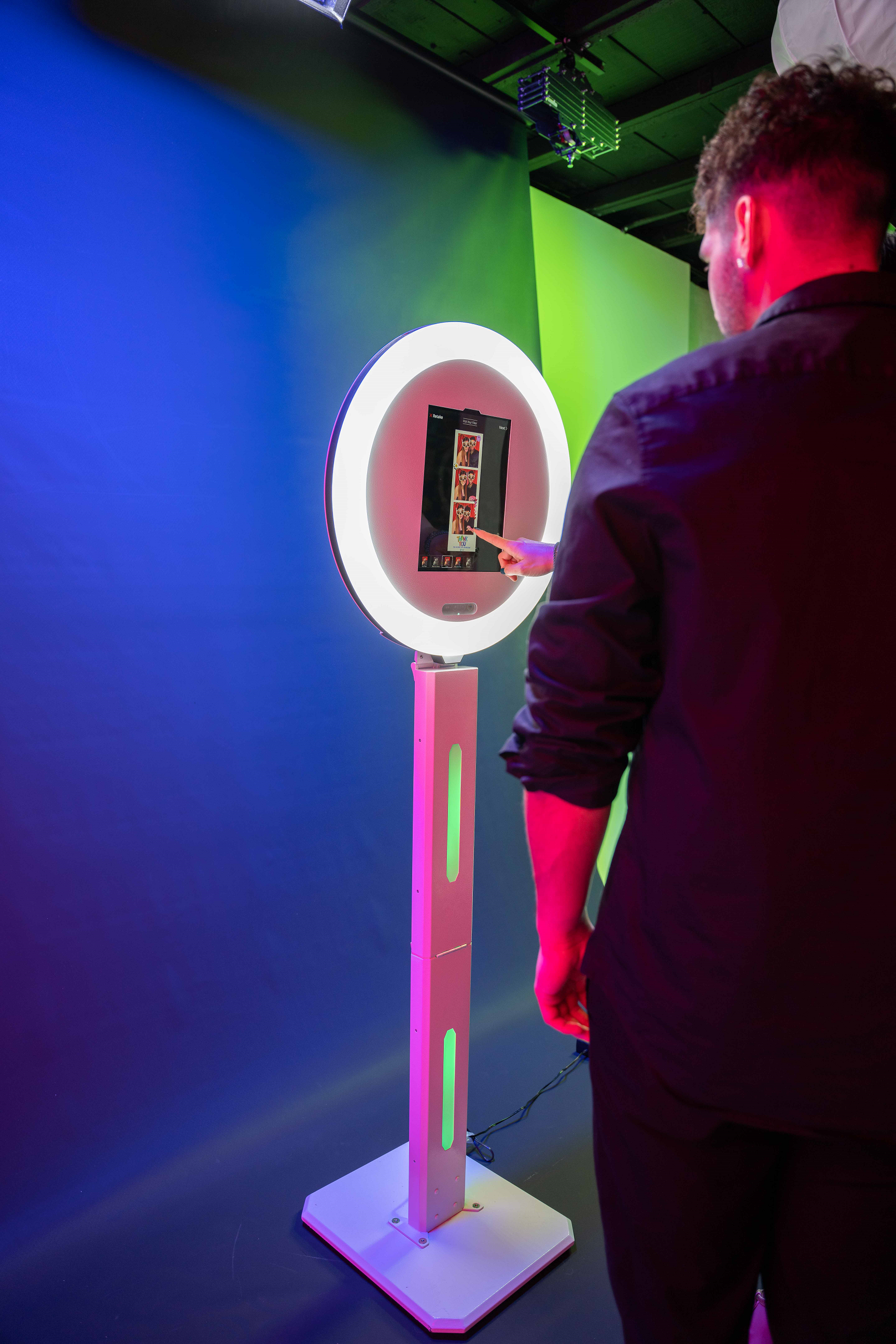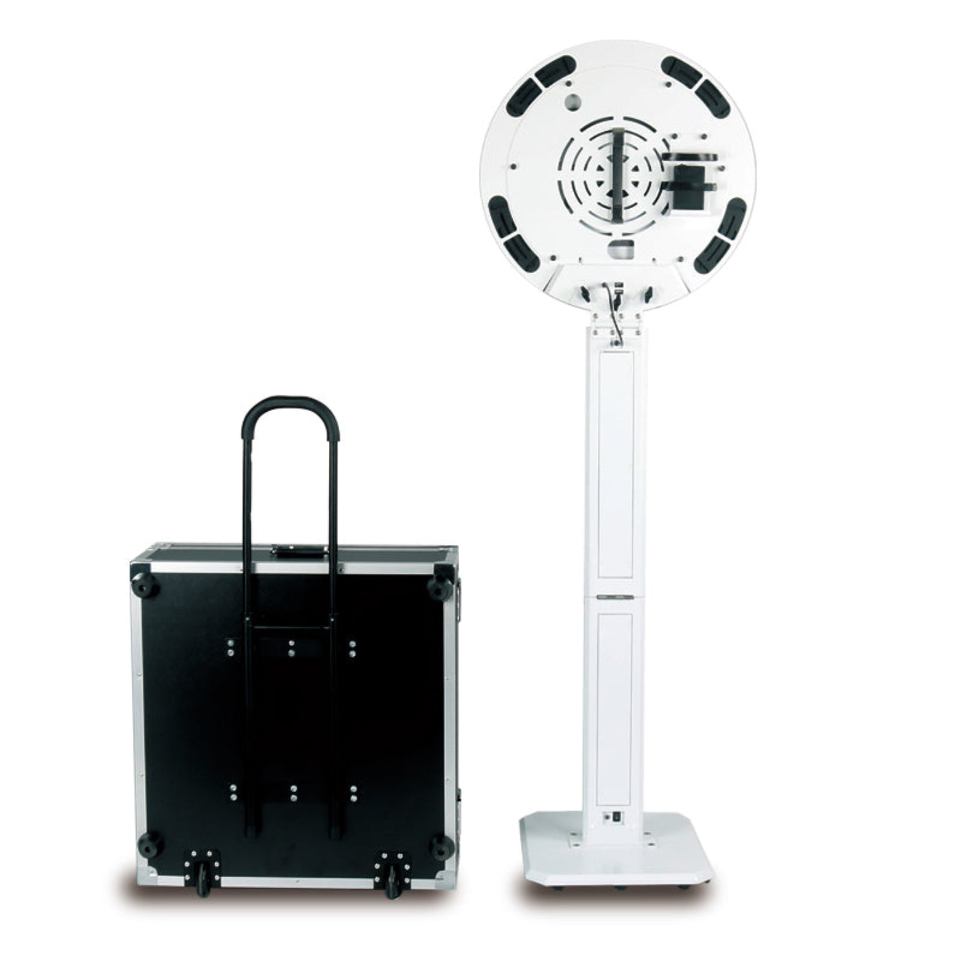 A: A sleek and portable 12.9" iPad-compatible photo booth shell designed for professional event photography, featuring a handheld "roamer" function for mobile use.