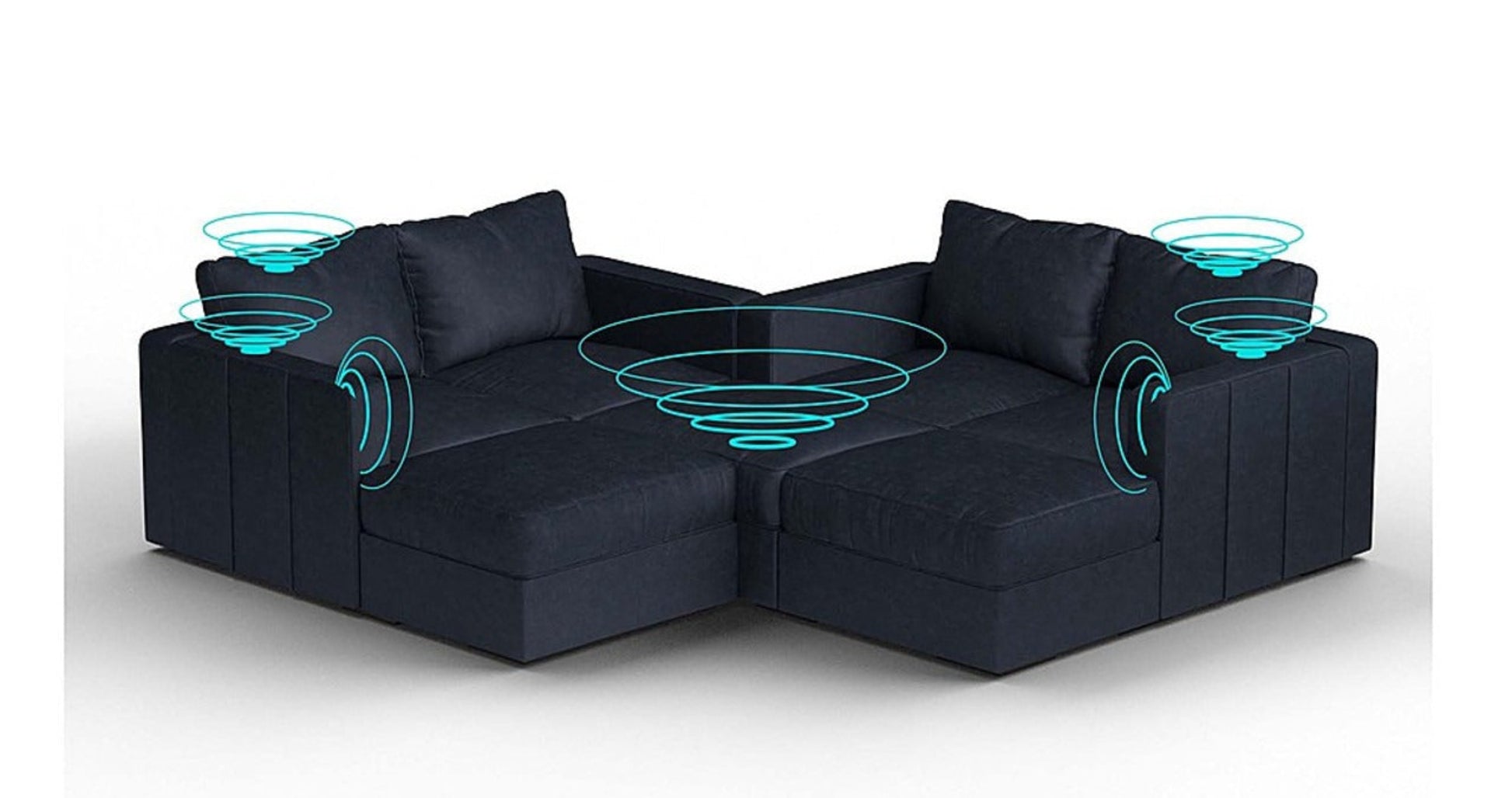 This system integrates 10 speakers into the sectional, delivering surround sound audio. It also includes a wireless charging system for your devices, all hidden within the furniture for a clean, clutter-free look.