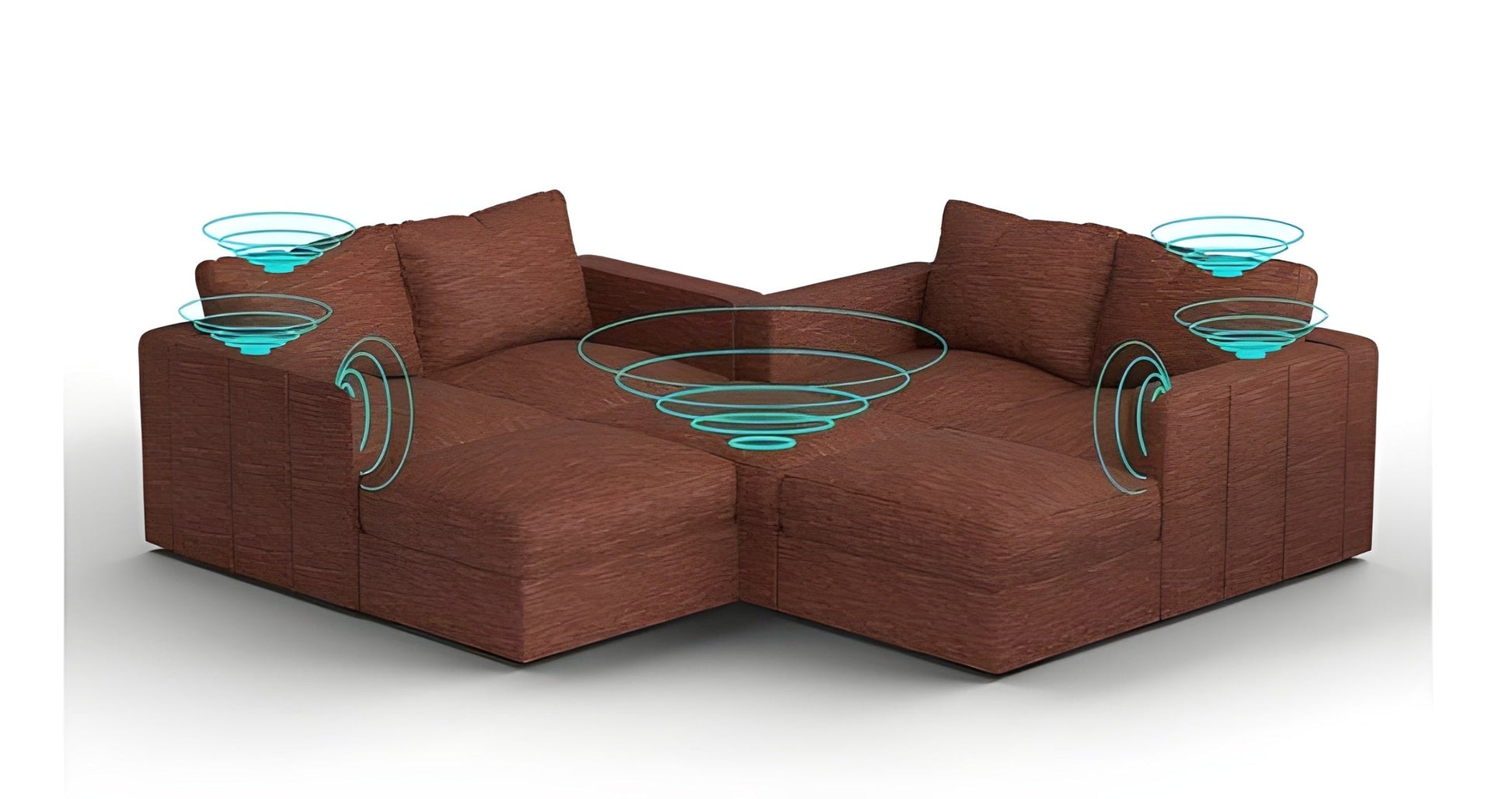 A: The speakers are seamlessly integrated into the furniture for a clutter-free audio experience, while the built-in charging ports offer easy access to power your devices.